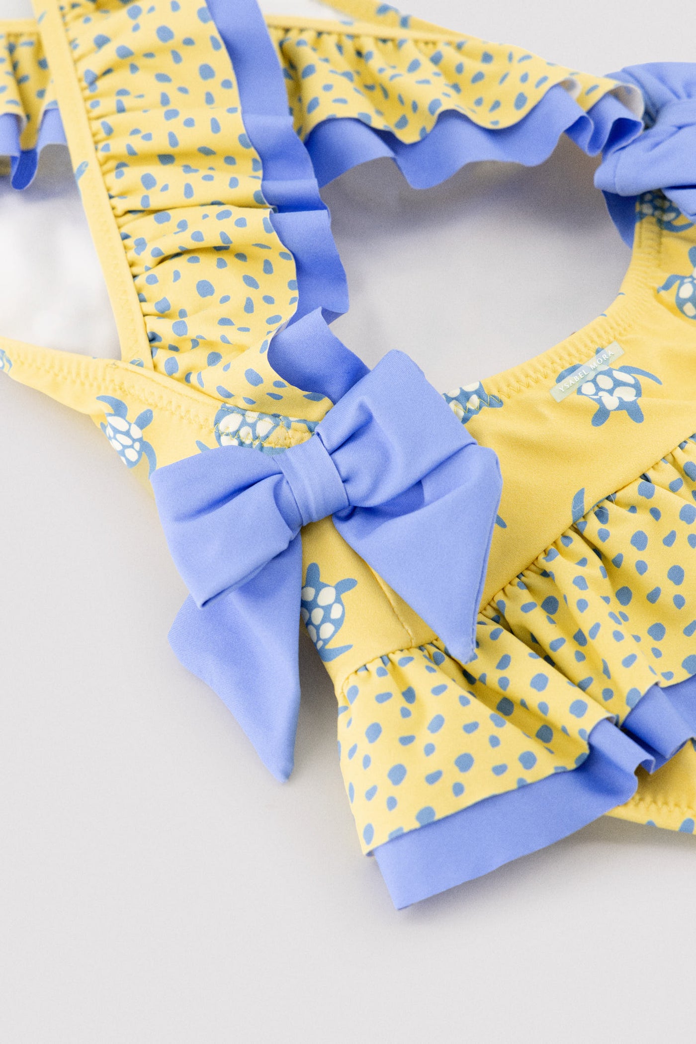 Bañador para niña con estampado de tortugas y lunares. Presenta una espalda espectacular con volantes cruzados y lazos lateral laterales.