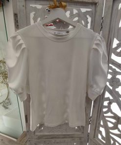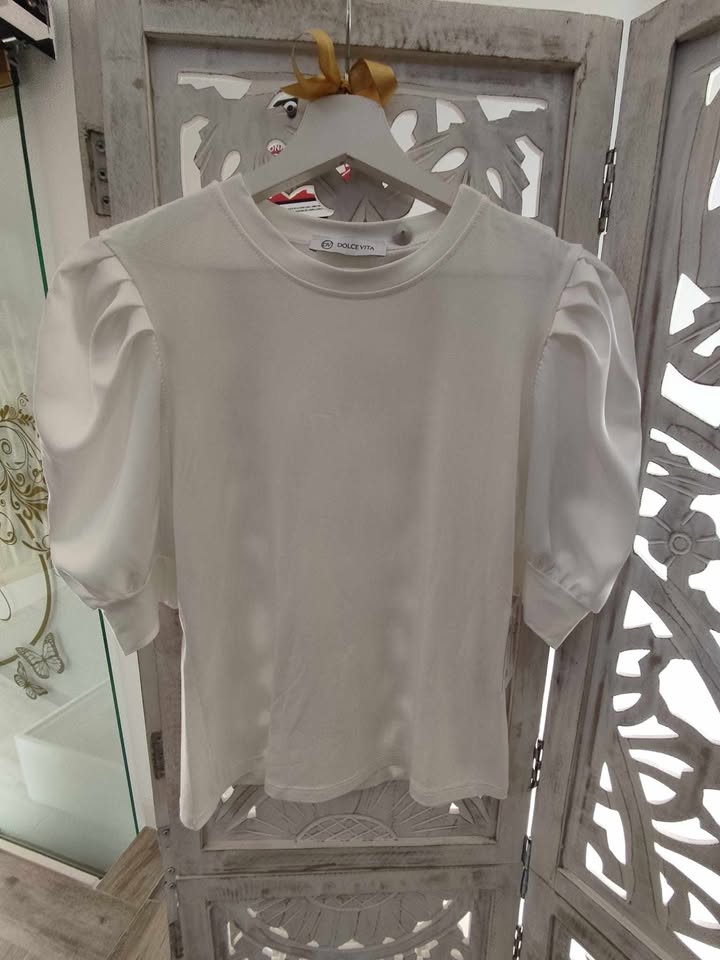 BLUSA DE COLOR BLANCO CON DISEÑO ABULLONADAS DANDO TOQUE ROMÁNTICO Y MODERNO.