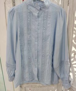 Blusa en delicado tono celeste confeccionada en tejido ligero y fluido, perfecta para aportar un toque elegante y femenino a cualquier look. Su diseño incorpora finos paneles bordados en la parte frontal combinados con tablas verticales que estilizan la silueta.