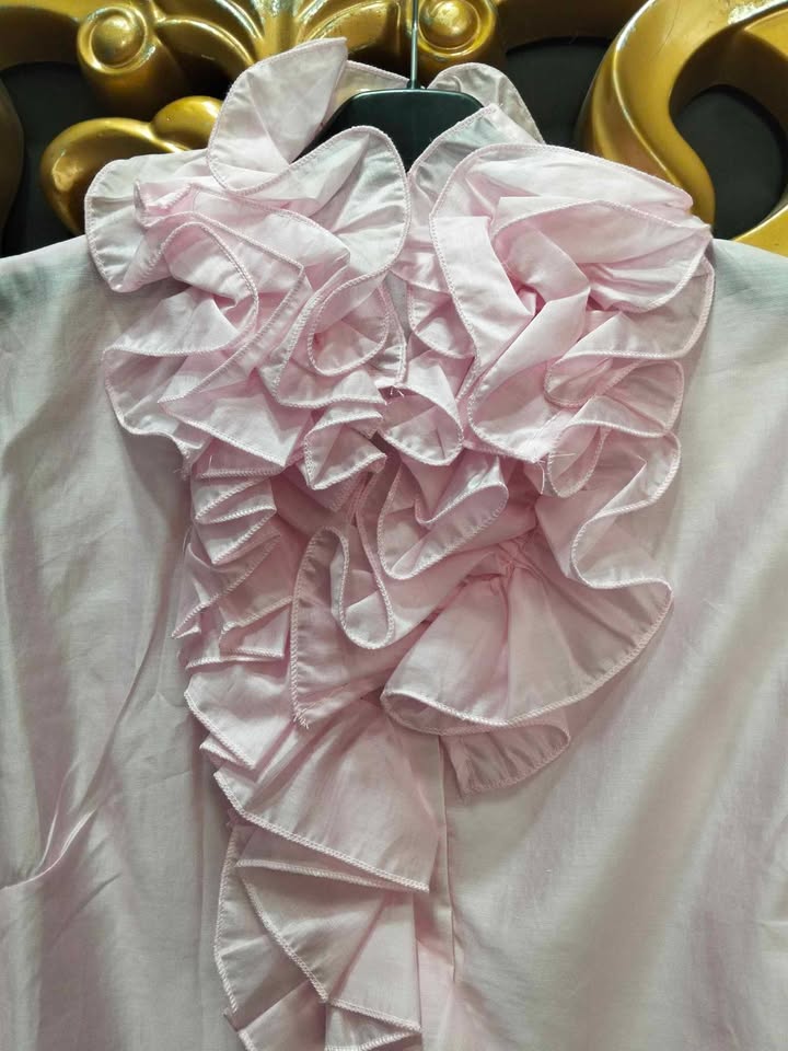 CUELLO CON VOLANTE FRUNCIDO QUE RODEA TODO EL CUELLO, CAYENDO HACIA EL PECHO.