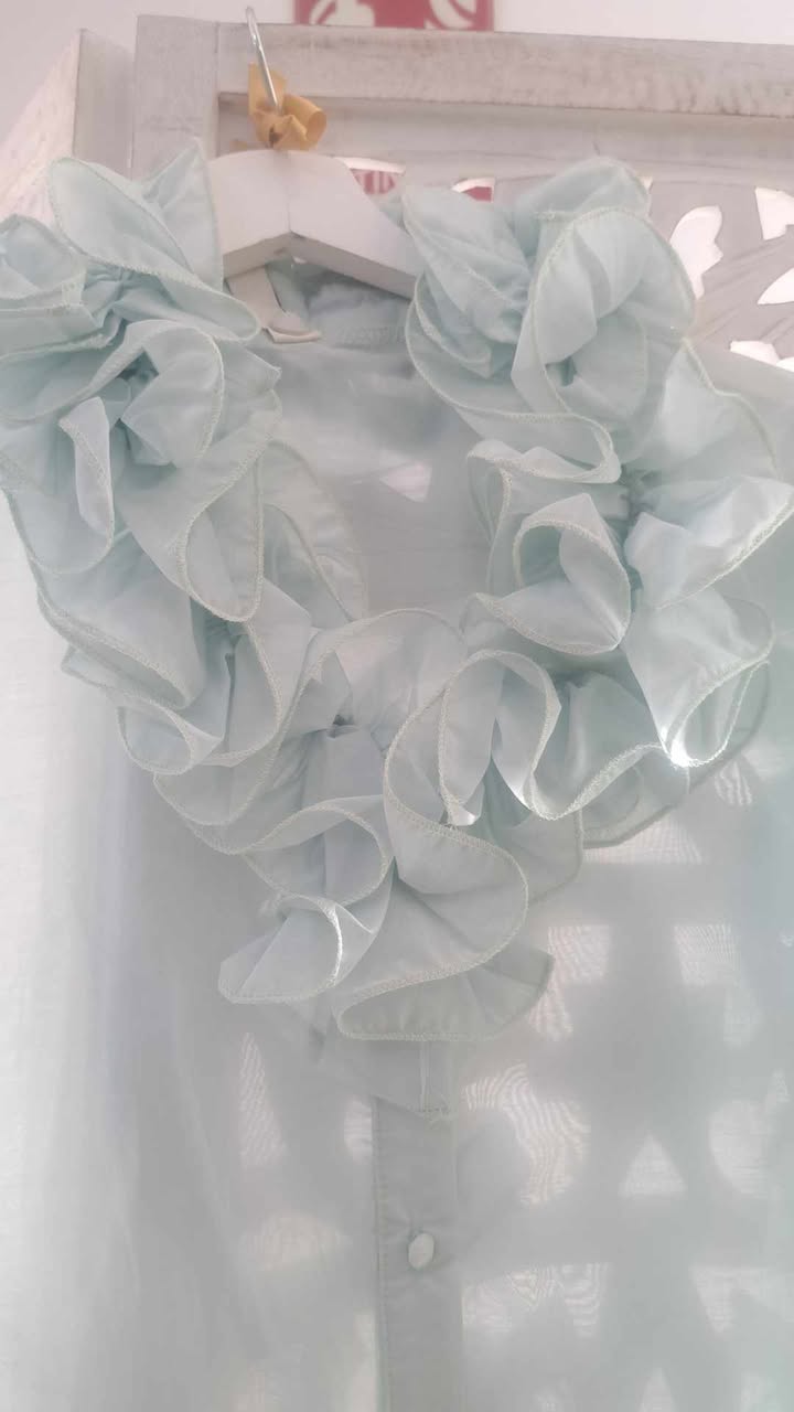 CUELLO CON VOLANTE FRUNCIDO QUE RODEA TODO EL CUELLO, CAYENDO HACIA EL PECHO.