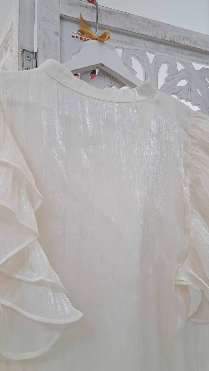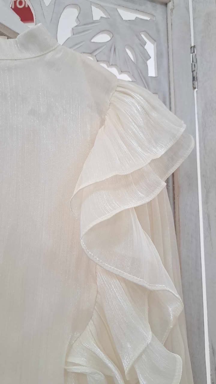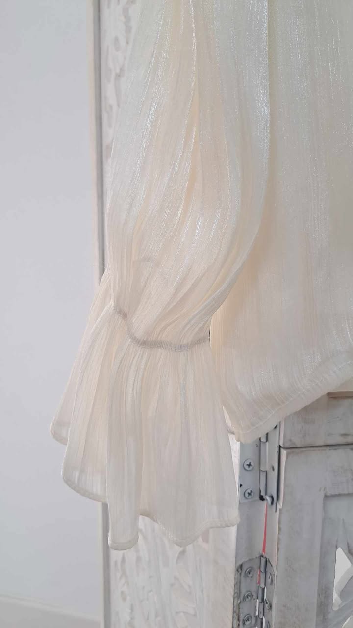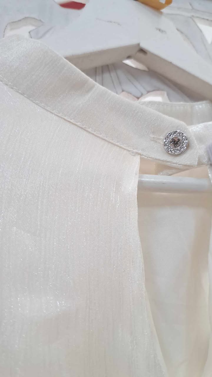 EN TONO MARFIL, TEJIDO FLUIDO Y LIGERAMENTE BRILLANTE.