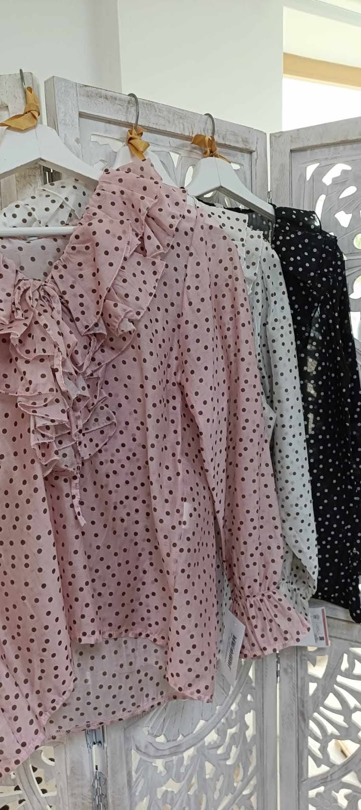 **Blusa romántica de lunares con volantes – Rosa empolvado**
