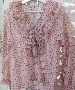 Blusa femenina en delicado tono rosa empolvado con estampado de lunares en contraste. Diseñada con un elegante escote en pico adornado con volantes en cascada que aportan movimiento y un aire romántico.