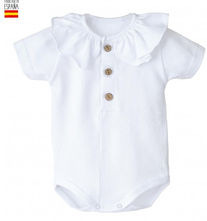 Precioso modelo de body con cuello volante ancho combinado con botones en color madera.