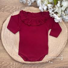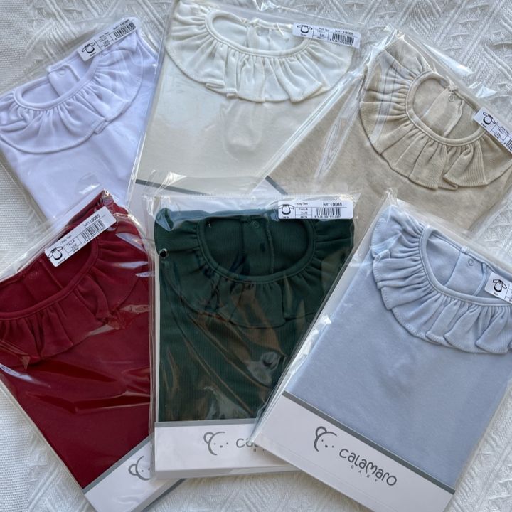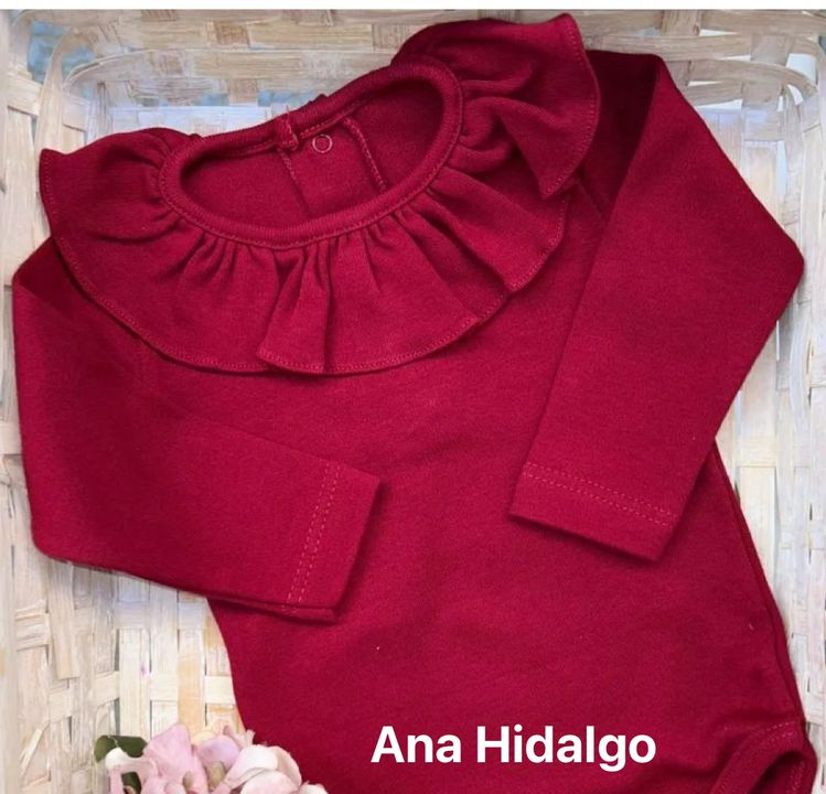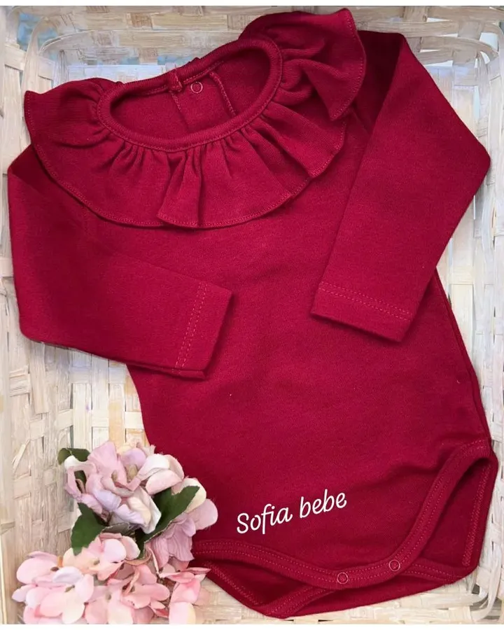 Body camiseta en manga larga, con generoso volante en cuello, abotonada en espalda y entrepierna