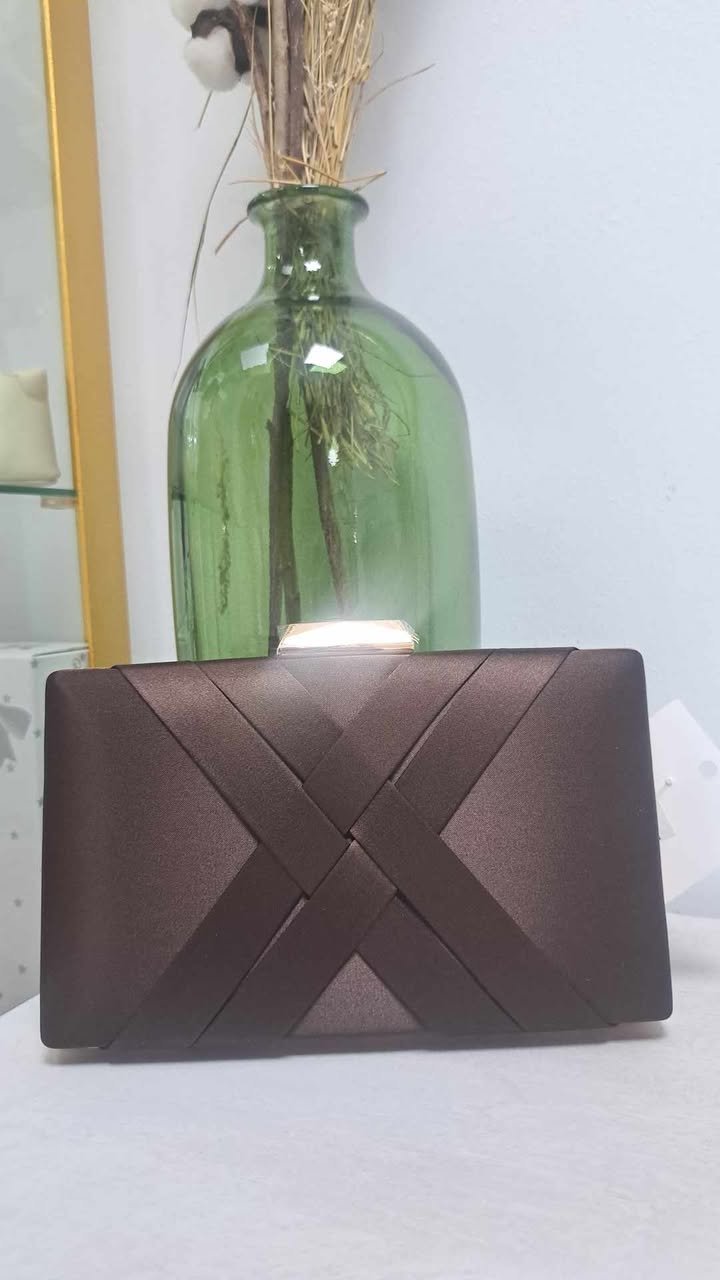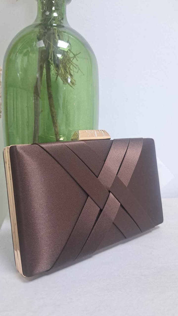 BOLSO DE FIESTA CON TIRAS TRENZADAS EN COLOR MARRÓN CHOCOLATE.