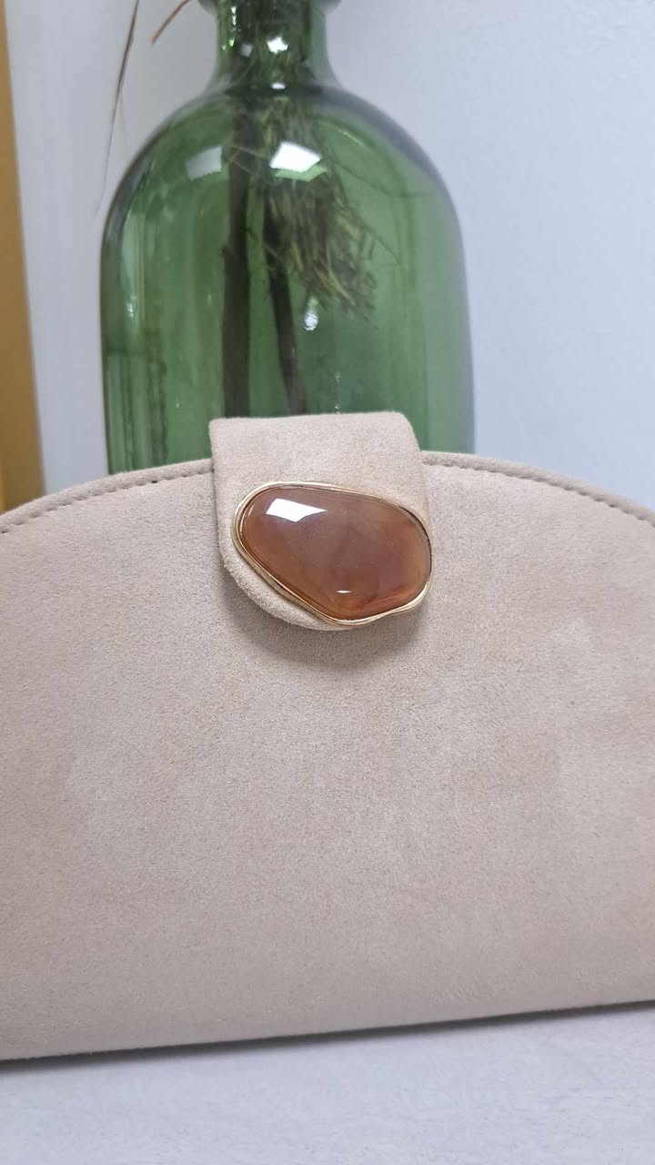 CIERRE CENTRAL CON UNA SOLAPA QUE INCLUYE DETALLE DE PIEDRA NATURAL EN TONO MARRÓN.