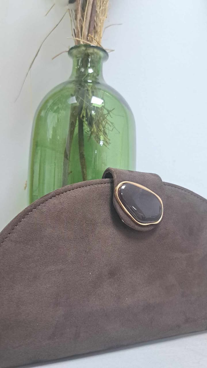 CIERRE CENTRAL CON UNA SOLAPA QUE INCLUYE DETALLE DE PIEDRA NATURAL EN TONO MARRÓN.