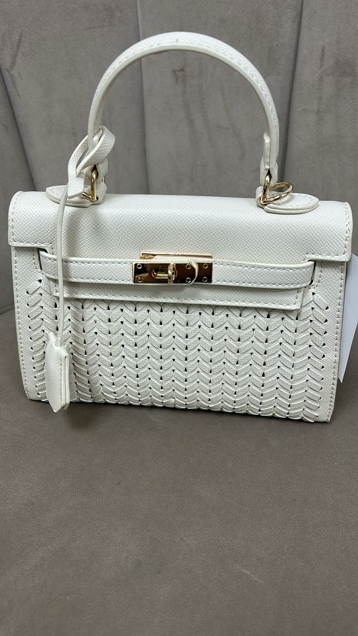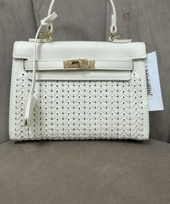 Elegante bolso estructurado en color beige con acabado texturizado y detalle frontal efecto trenzado que aporta un toque sofisticado y moderno. Su diseño compacto incluye asa superior rígida para llevar en la mano y herrajes metálicos en tono dorado que realzan su estilo. Cuenta con cierre frontal tipo giratorio que brinda mayor seguridad y un acabado de inspiración clásica.