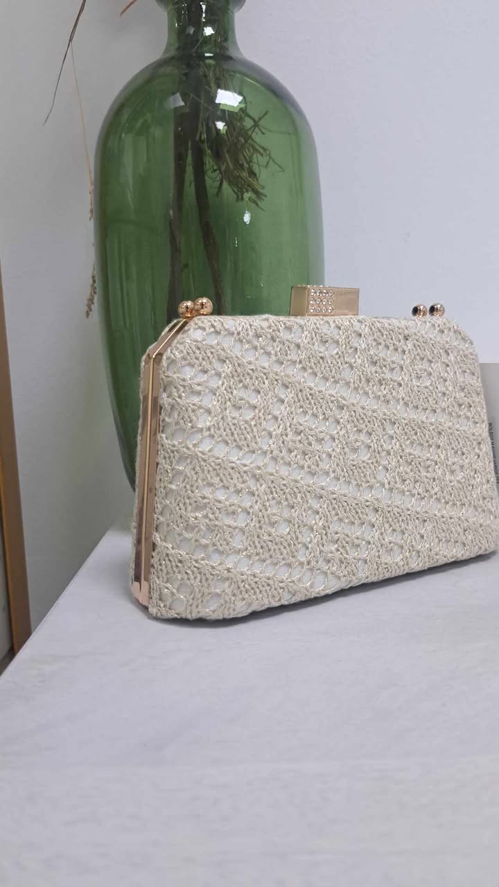 TEJIDO INTRINCADO QUE SE ASEMEJA AL CROCHET EN UN TONO BEIGE.