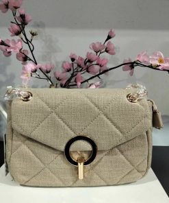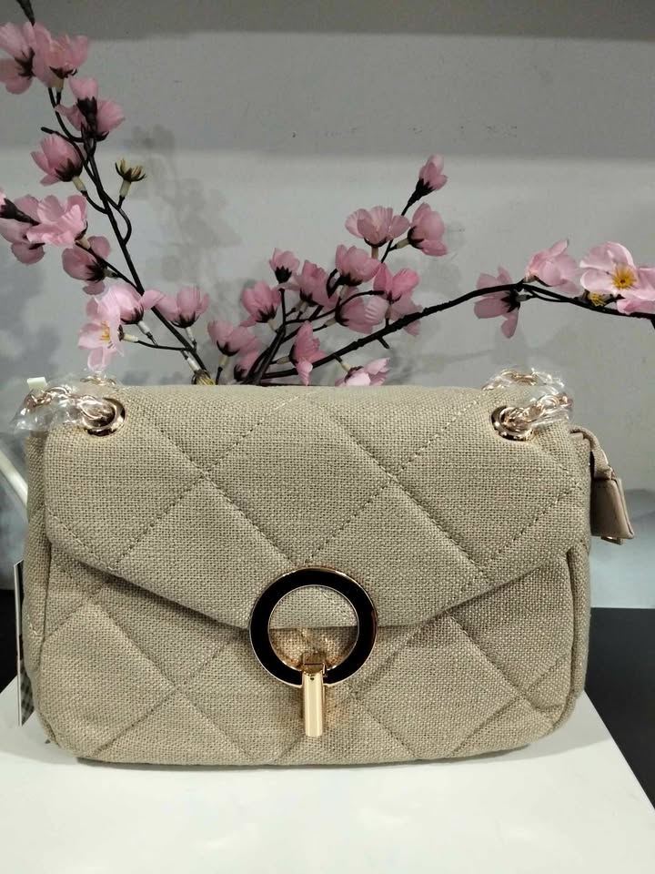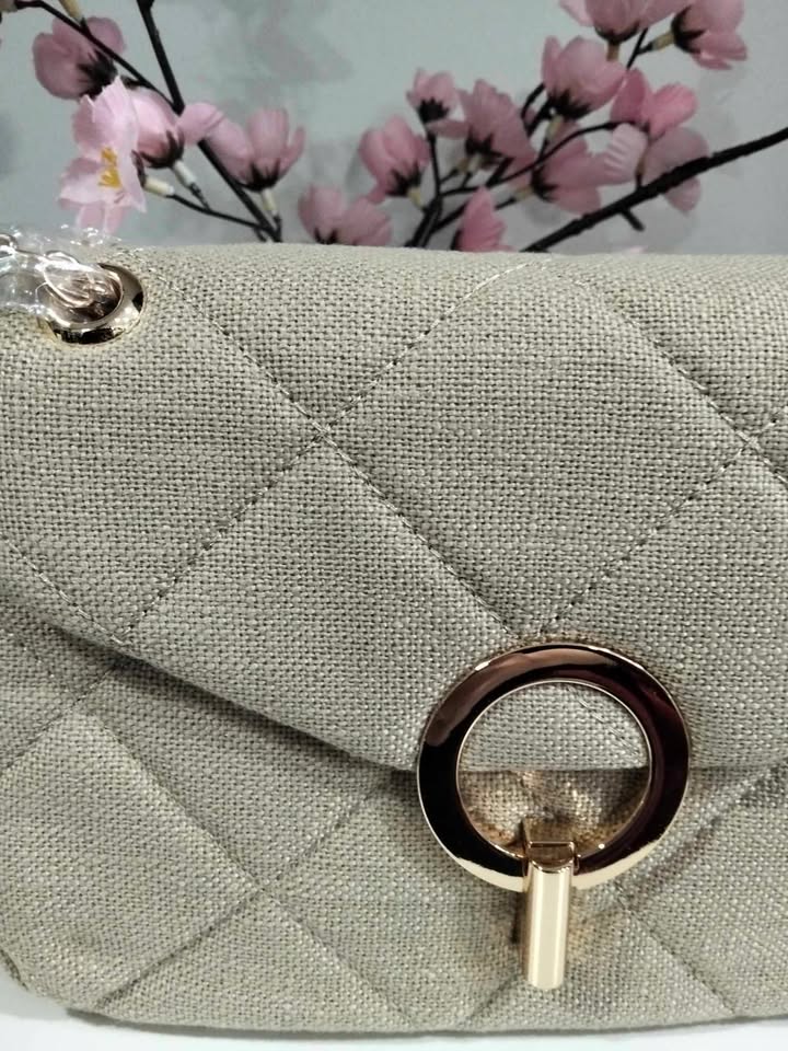 BOLSO DE TELA EN COLOR BEIGE CON CIERRE DE HEBILLA REDONDA DORADA.
