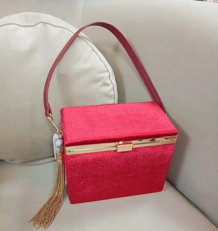 BOLSO RECTANGULAR DE TERCIOPELO CON DETALLES DORADOS.