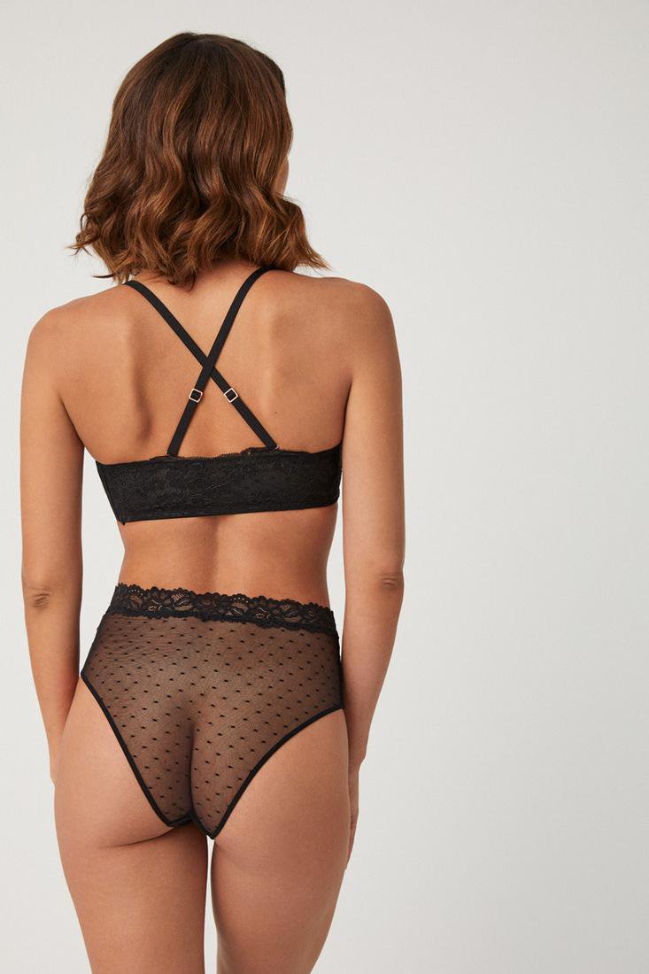 Lingerie Collection. Mix de materiales en esta braga alta brasileña. Tul plumeti y encaje floral dan forma a esta prenda sensual y femenina. Combínala con un sujetador a juego de la colección y crea tu set perfecto.