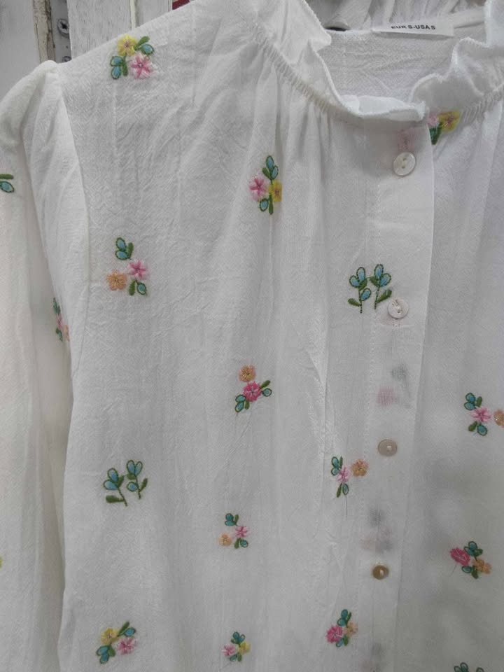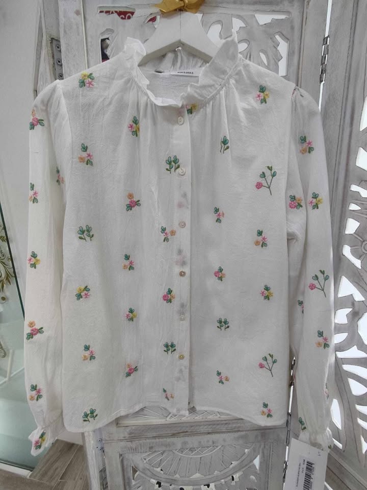 Blusa en color blanco confeccionada en tejido ligero y vaporoso, perfecta para aportar frescura y delicadeza a cualquier look. Su diseño destaca por el bordado floral multicolor distribuido por toda la prenda, que añade un toque alegre, femenino y primaveral.