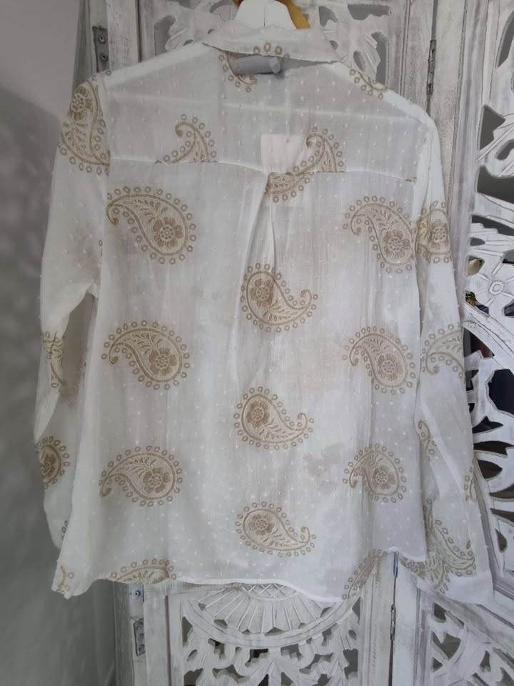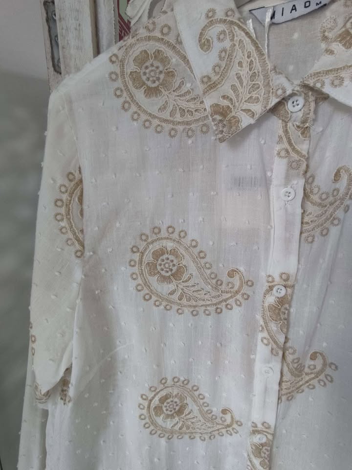 CAMISA BLANCA DE PLUMETI CON ESTAMPADO EN COLOR BEIGE