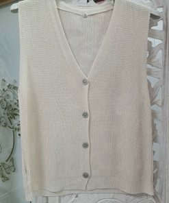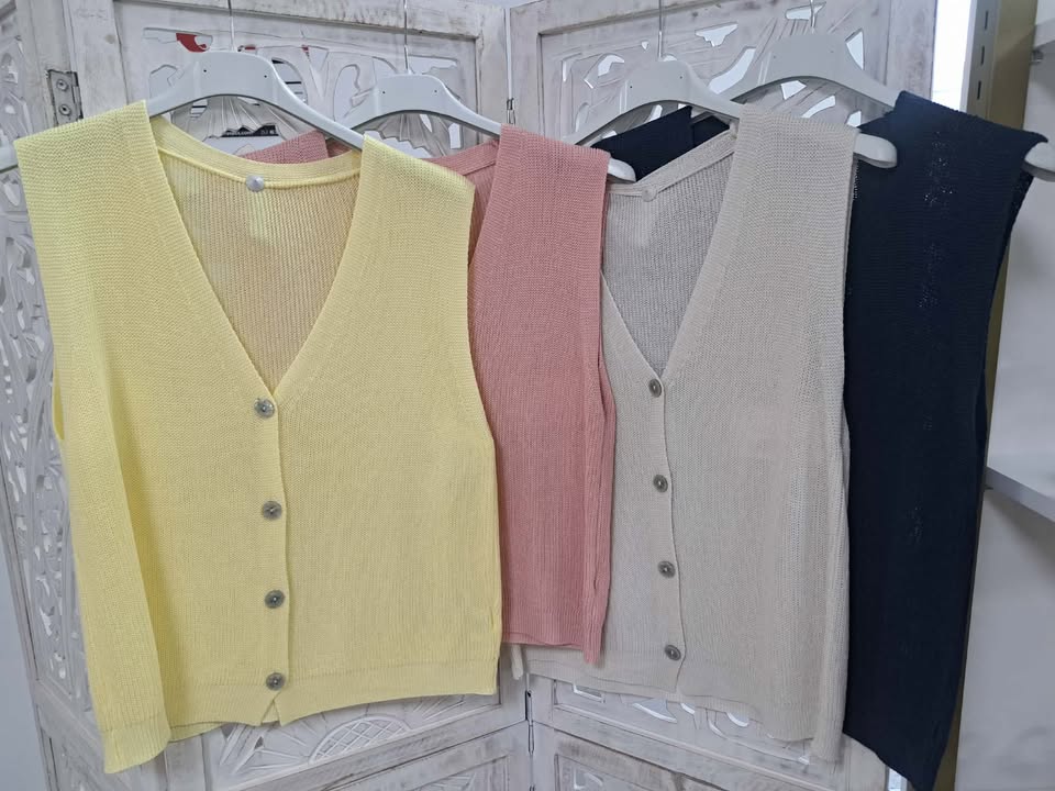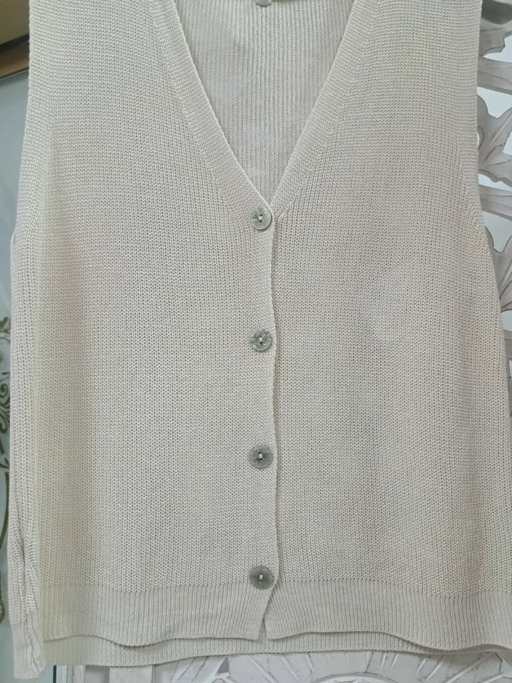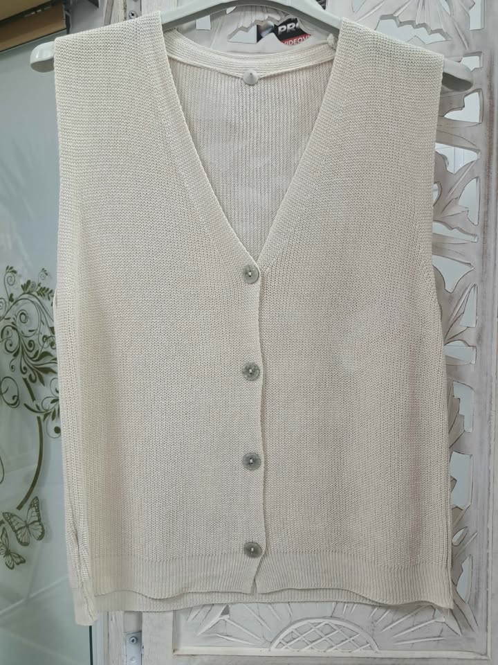 CHALECO SIN MANGAS COLOR BEIGE, TEJIDO LIGERO Y TRANSPARENTE.