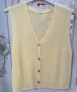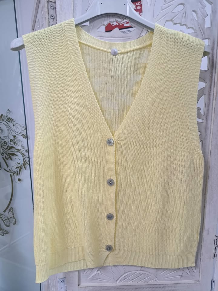 CHALECO SIN MANGAS COLOR AMARILLO PASTEL, TEJIDO LIGERO Y TRANSPARENTE.