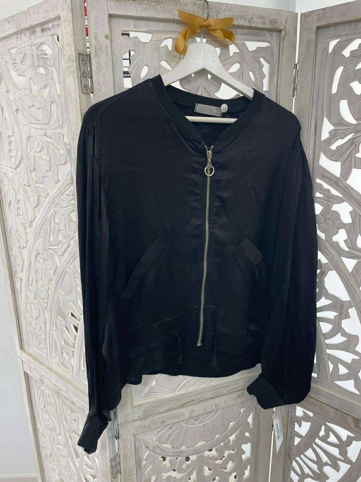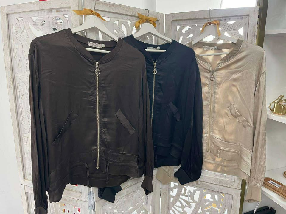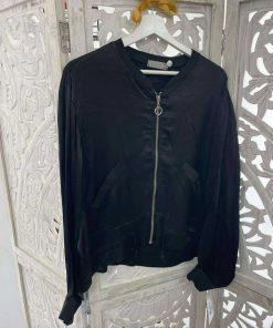 Chaqueta bomber con cremallera negra y tejido satinado. Ajustable en la cintura con cordón.