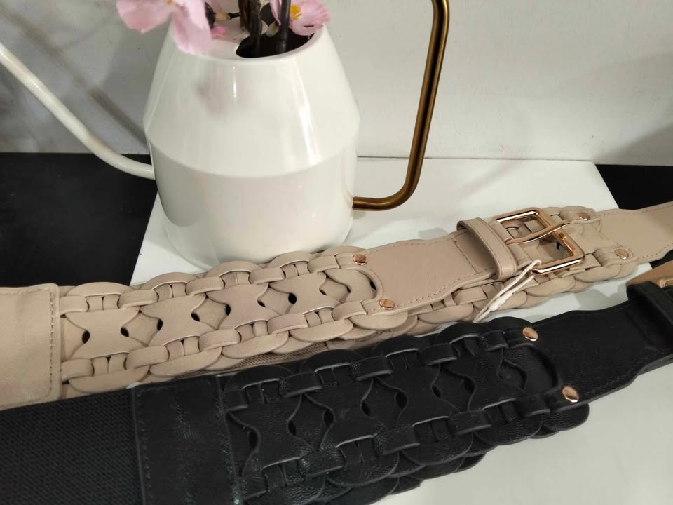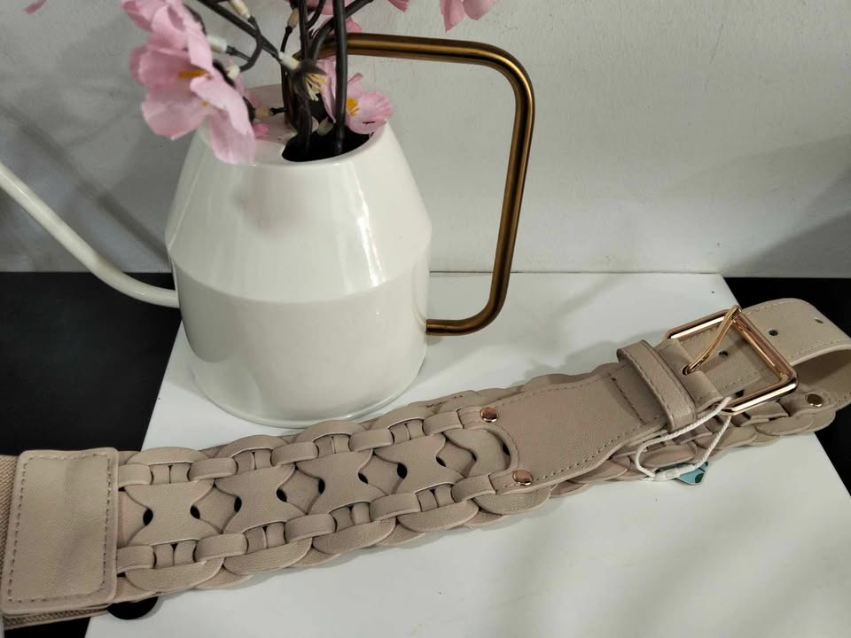 CINTURÓN ELÁSTICO CON TRENZADOS EN COLOR BEIGE.