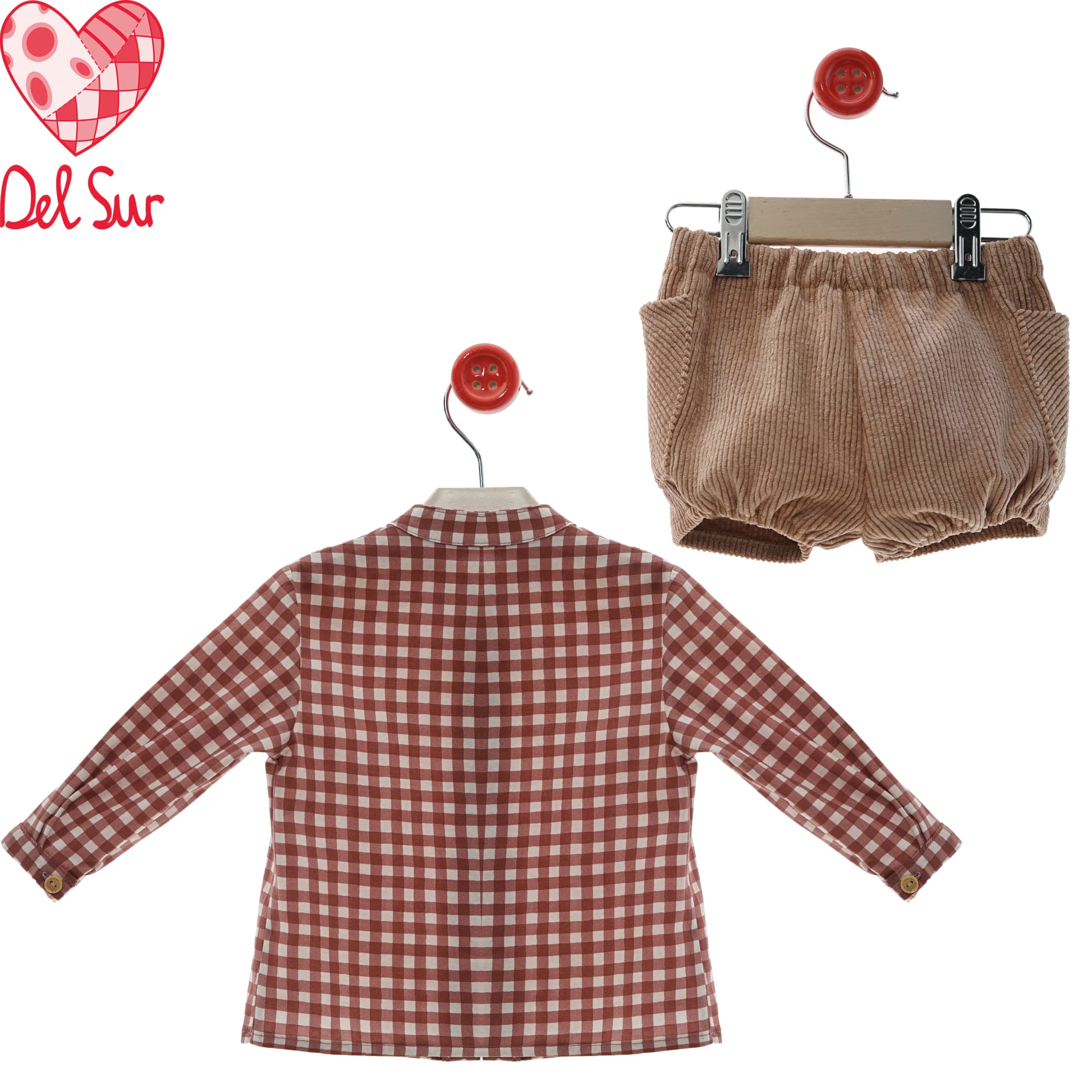 Conjunto de dos piezas ,compuesto por pantalón tipo pana en color camel y camisa en cuadros Vichy en color teja con botones de madera .