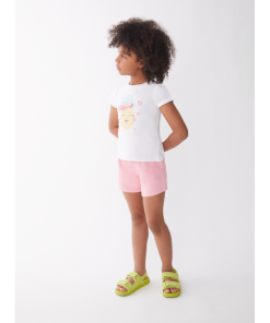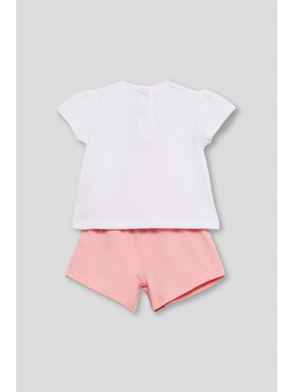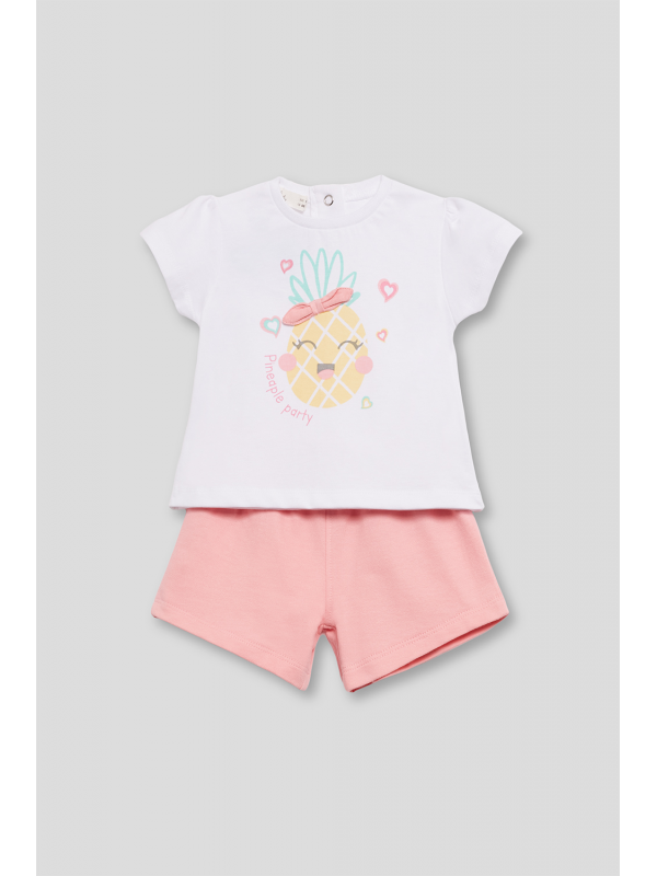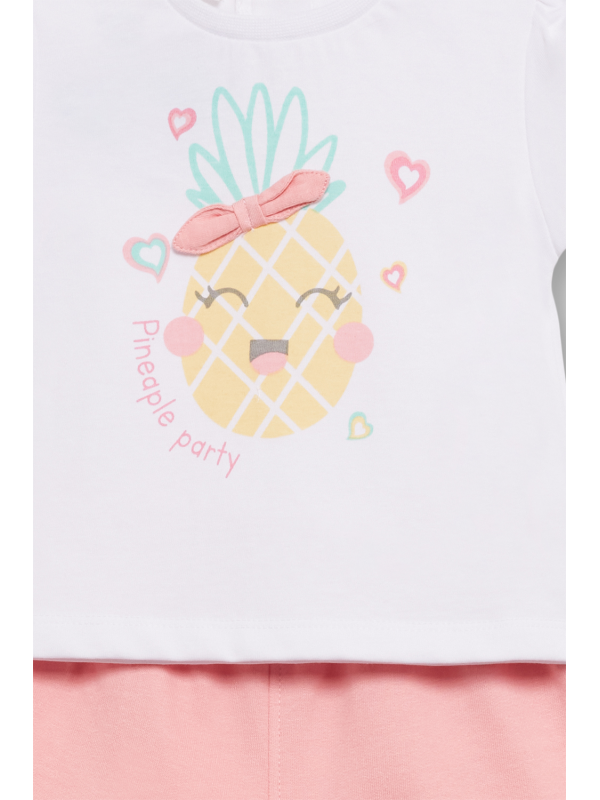Conjunto de dos piezas, camiseta y short para bebé niña de 3 meses a 6 años. Camiseta blanca de manga corta con un bonito estampado de piña decorada con lazos y pequeños corazones en tonos pastel. Cuello redondo y cierre de botones en la espalda en tallas de meses para facilitar la puesta. Short en color rosa empolvado, con cintura elástica para un ajuste cómodo y confeccionado en un tejido ligero y suave. Un conjunto fresco y versátil para los días soleados. ¡Dale un toque tropical a su verano!