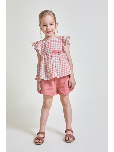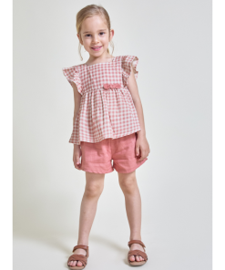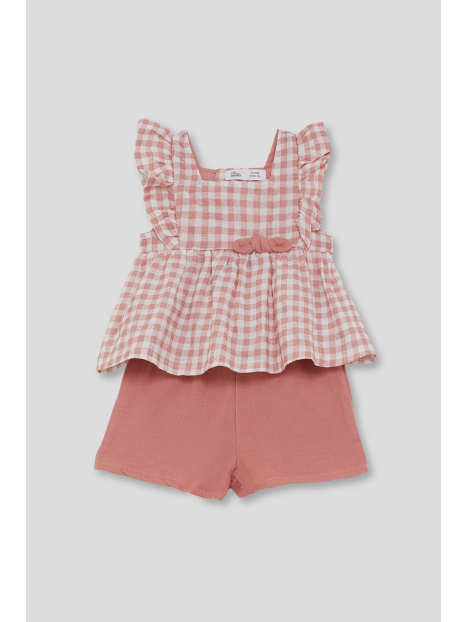 Conjunto para bebé niña de 3 meses a 6 años. Blusa sin mangas en vichy maquillaje con volantes y lazo decorativo en la cintura. Shorts lisos a juego en color maquillaje, con cinturilla elástica para mayor comodidad. Ideal para looks frescos y veraniegos.
