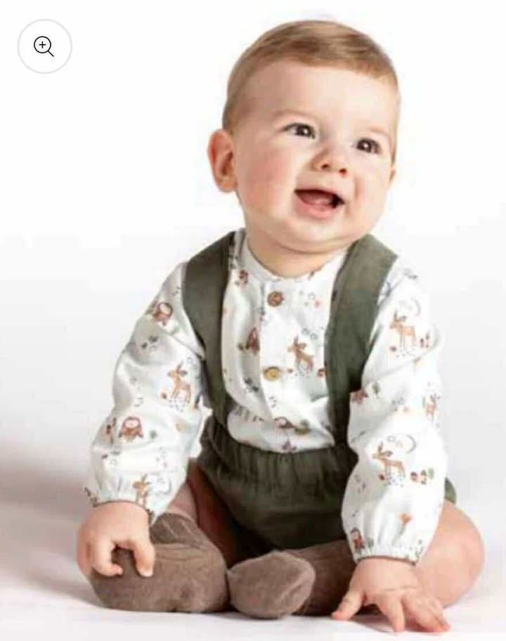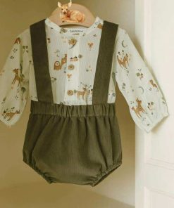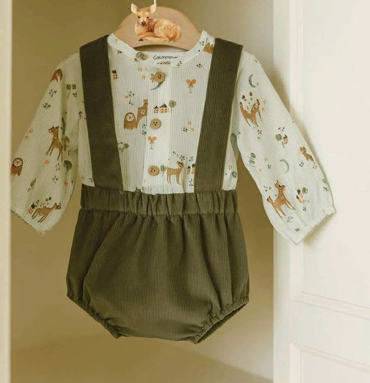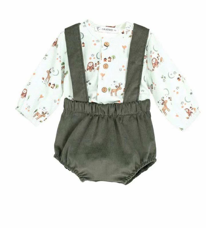 Este conjunto es puro amor a primera vista Diseñado con un aire otoñal encantador, combina una blusa de algodón con estampado de animalitos del bosque sobre fondo verde menta suave, y un pololo de pana verde musgo con tirantes, que aporta calidez y estilo.