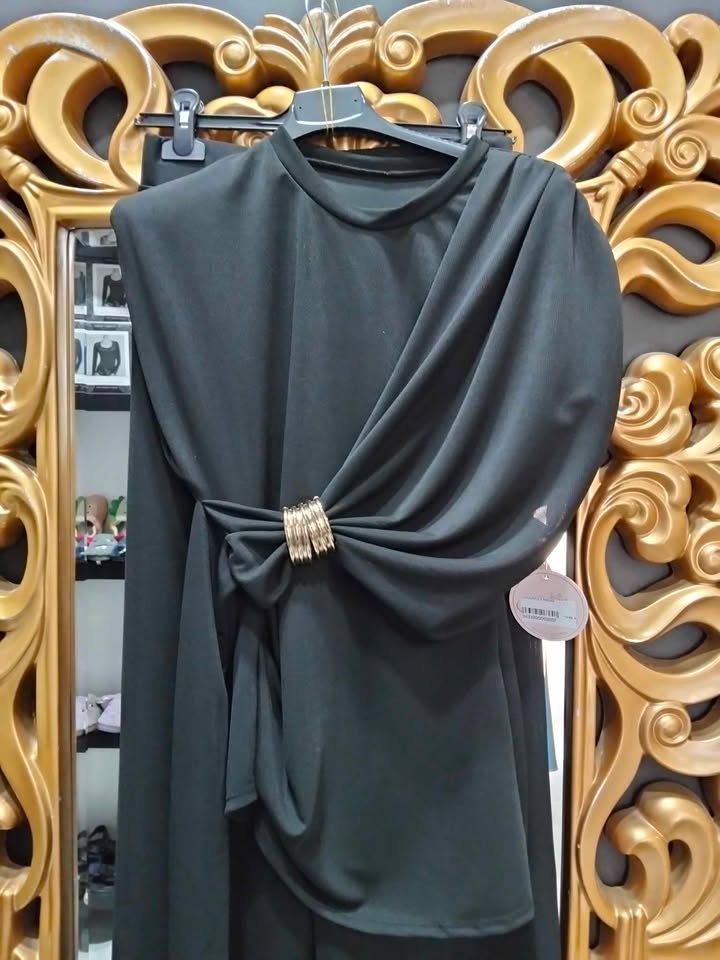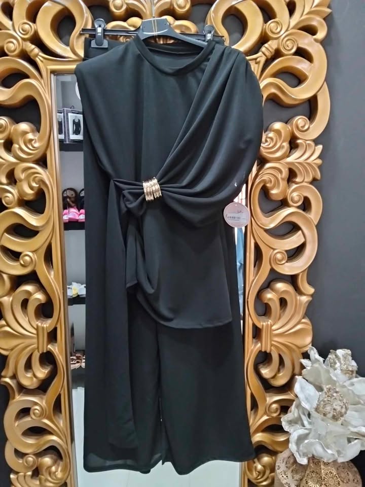 CONJUNTO DE DOS PIEZAS EN NEGRO, COMPUESTO POR PANTALÓN DE PIERNA ANCHA Y UNA BLUSA A JUEGO.