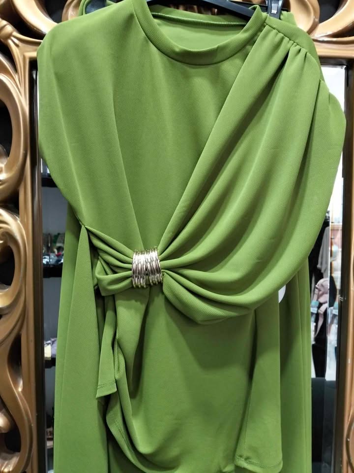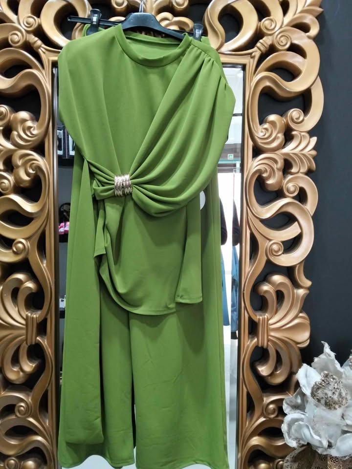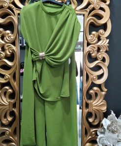 CONJUNTO DE DOS PIEZAS EN VERDE PISTACHO, COMPUESTO POR PANTALÓN DE PIERNA ANCHA Y UNA BLUSA A JUEGO.