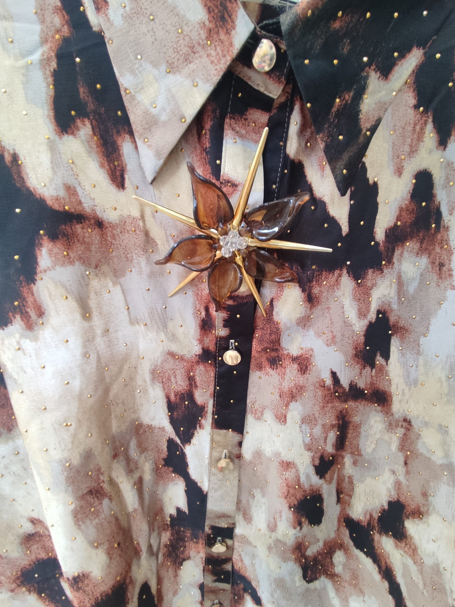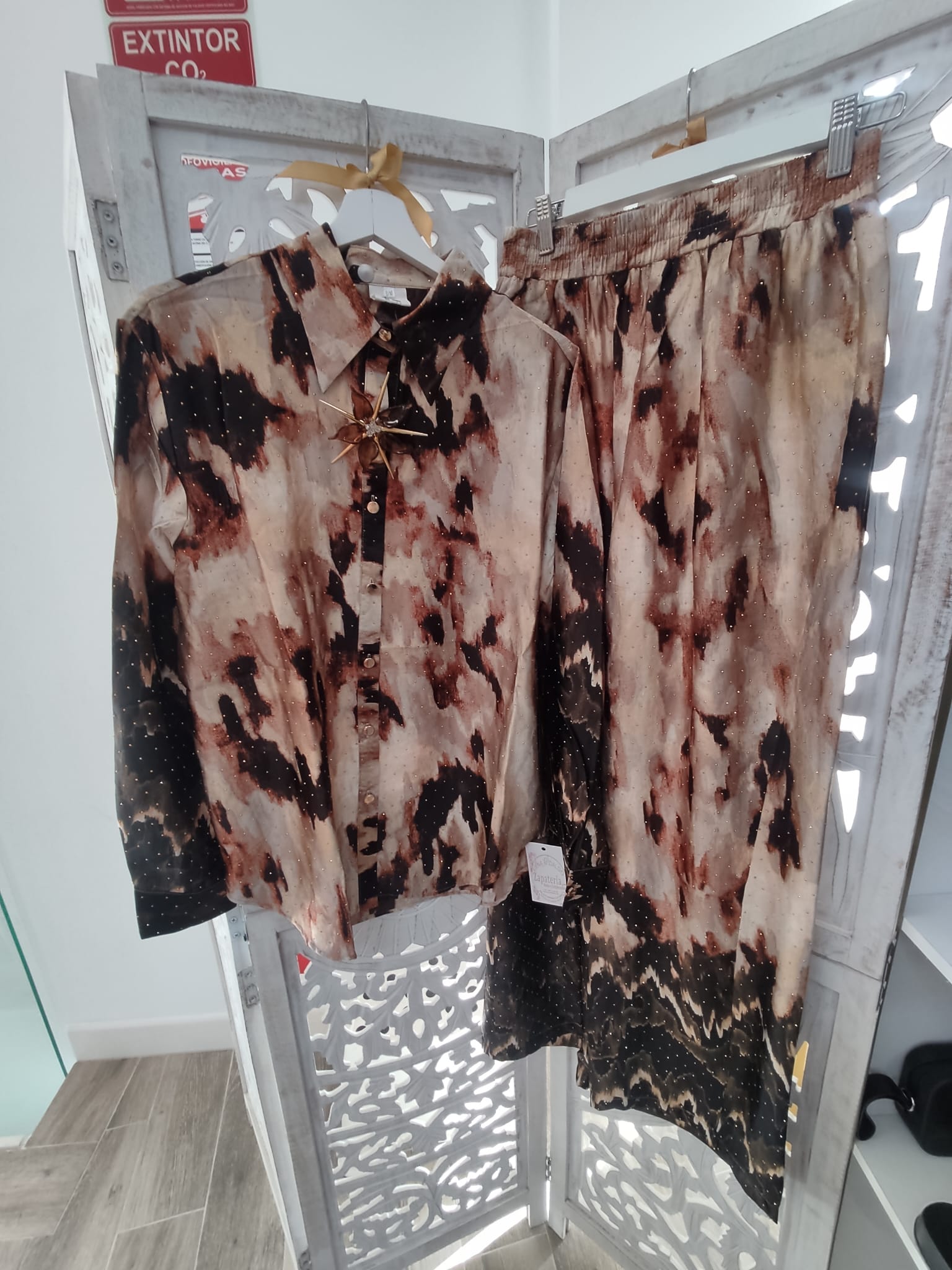 CONJUNTO ESTAMPADO DE PANTALÓN Y CAMISA CON DETALLES DORADO Y BROCHE