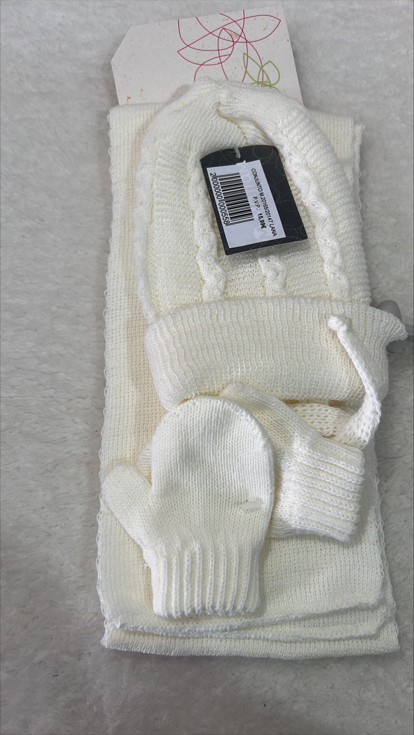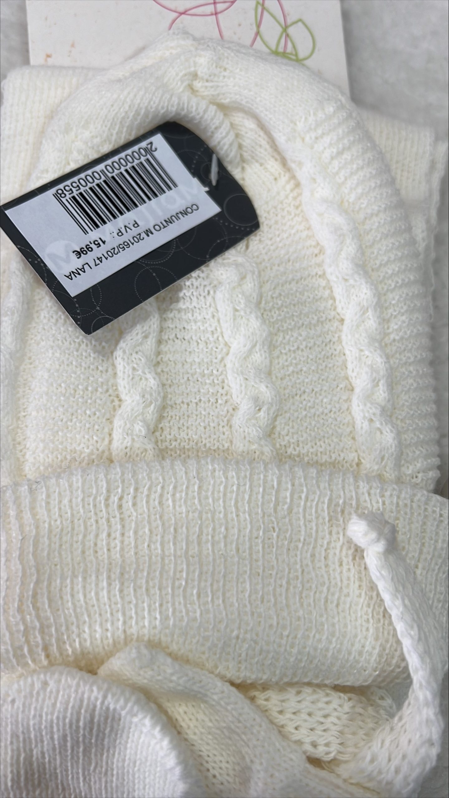 Precioso modelo de conjunto de 3 piezas de lana. Color marfil