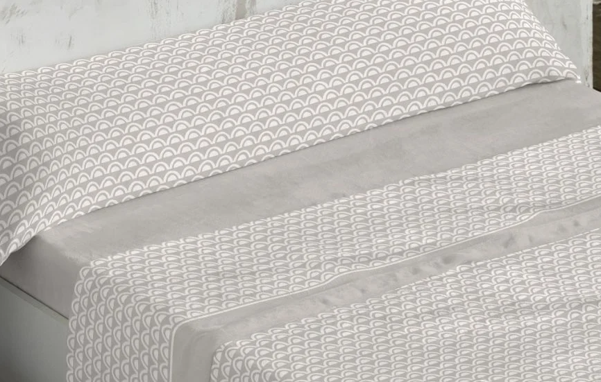 Este juego de cama Coralina lleva un estampado en forma de semi-circulos lineales por todo la sábana encimera en color blanco sobre un fondo gris, la sábana bajera es totalmente lisa en color gris y la funda de almohada lleva el mismo diseño que la sábana encimera.