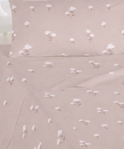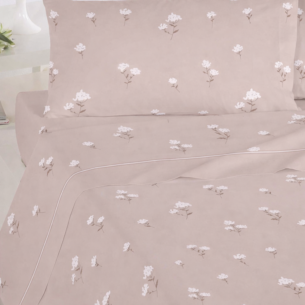 Está compuesto por tres piezas: sábana encimera y almohadón con un fino estampado de ramitas florales, y bajera lisa a juego, creando una combinación equilibrada y muy decorativa. El tono nude le aporta serenidad y calidez, perfecto para crear un ambiente relajante y acogedor.