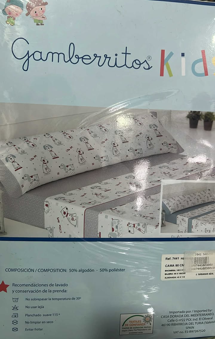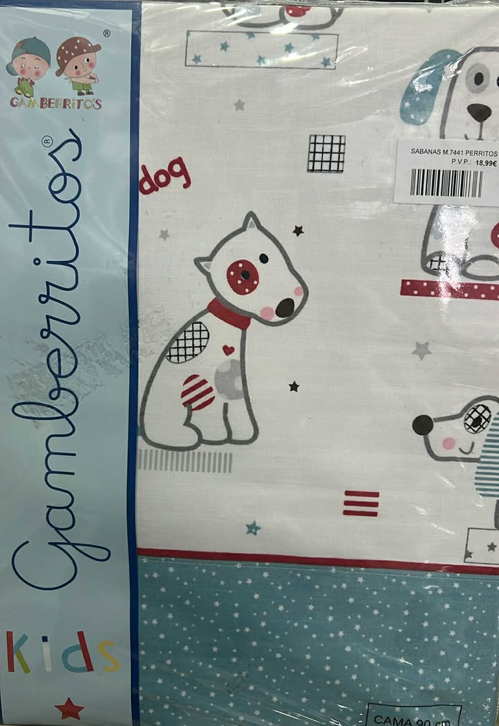 Precioso modelo de juego de sábanas de 90cm de tela de la marca GAMBERRITOS . Estampado perritos en tonalidad azul con estrellas.