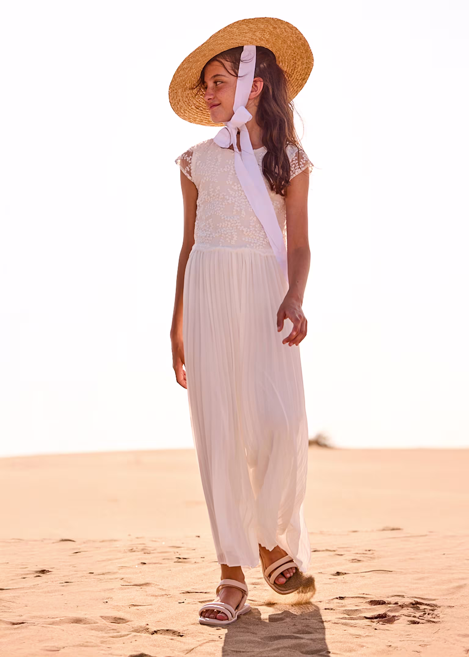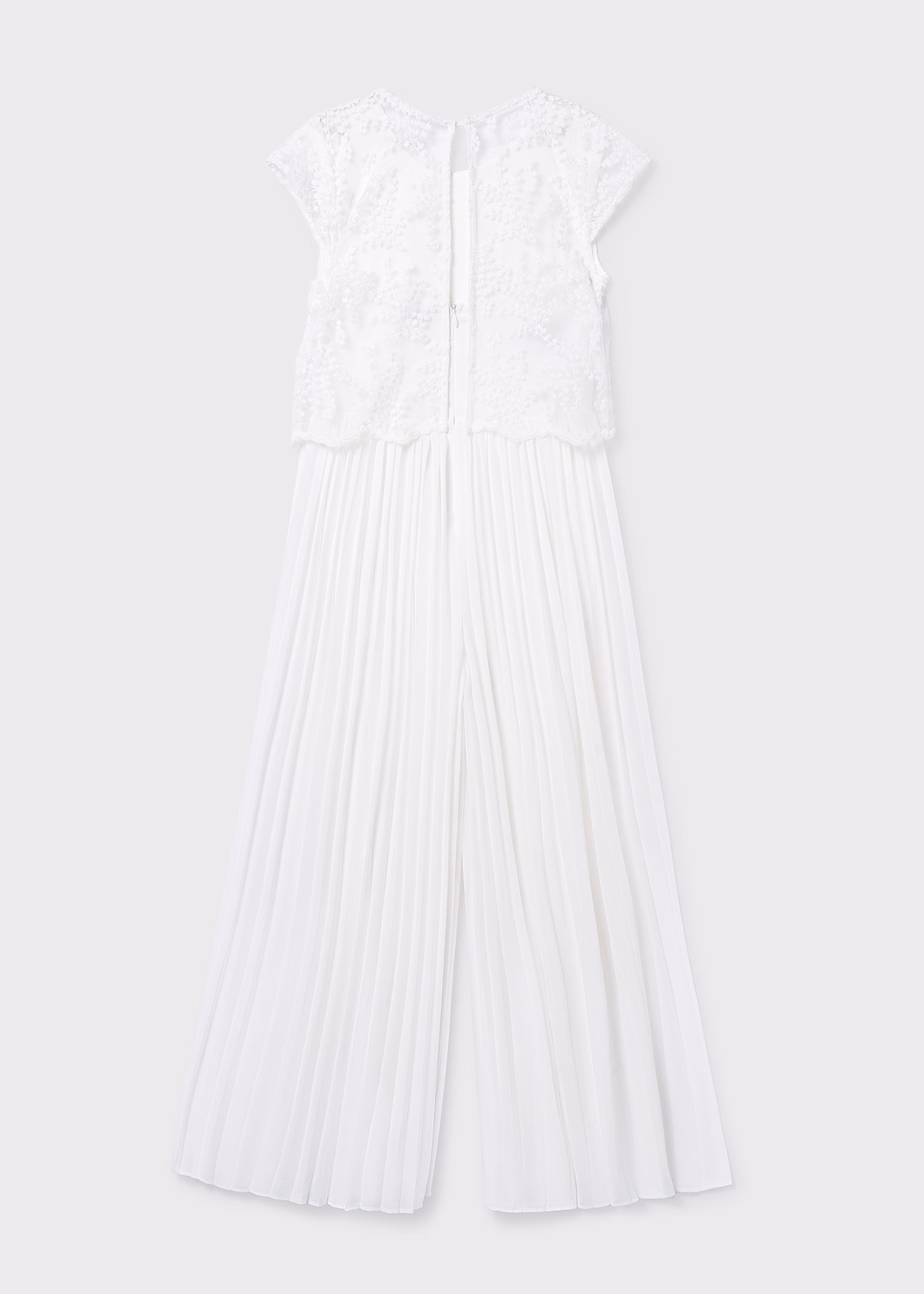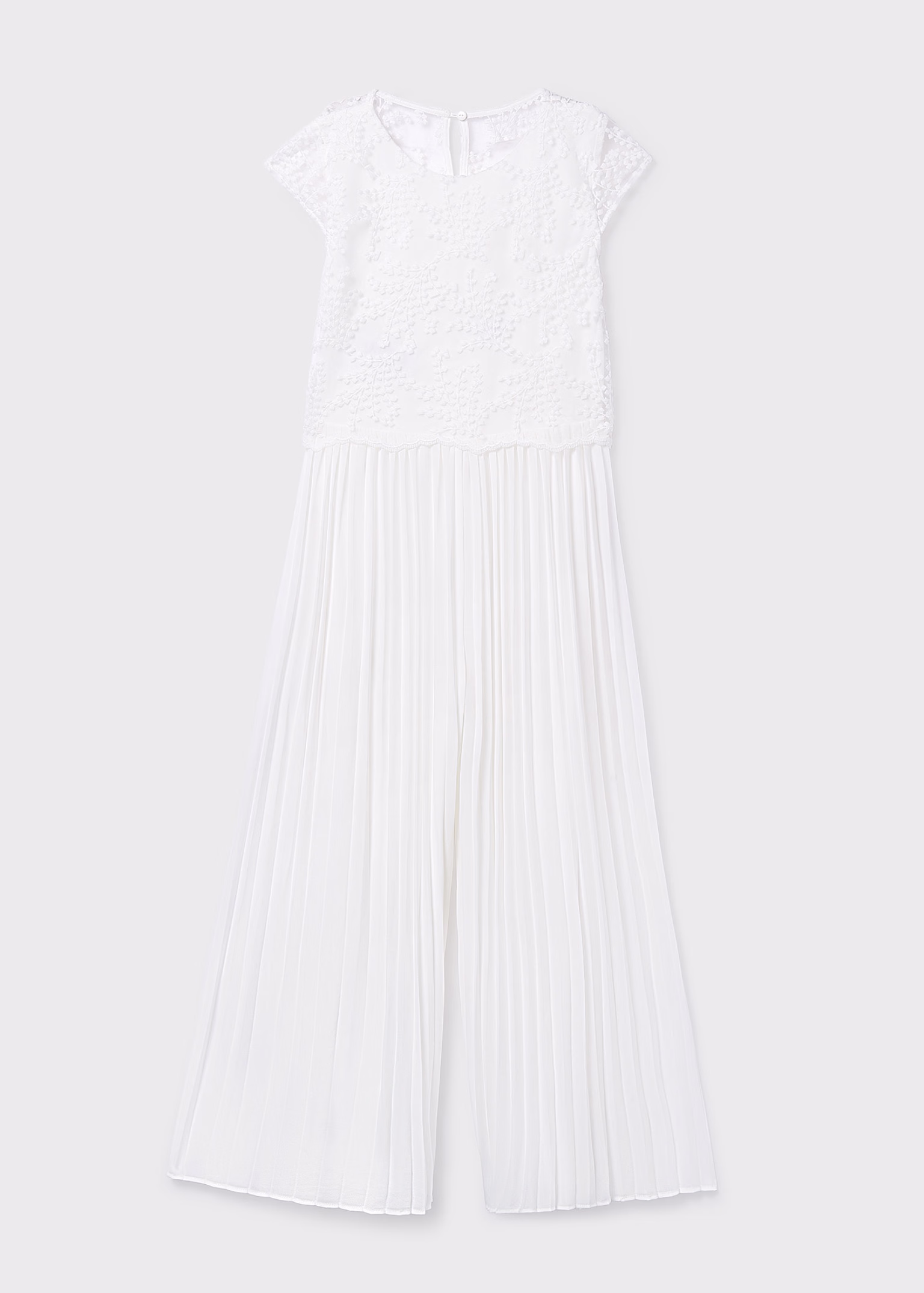 Mono plisado para chica. Incorpora manga corta y cuello redondo. Cuenta con cierre de botón en la parte posterior. La pernera es ancha con acabado plisado, el mono está decorado con bordados florales. Presenta abertura en la espalda con detalle de botón.