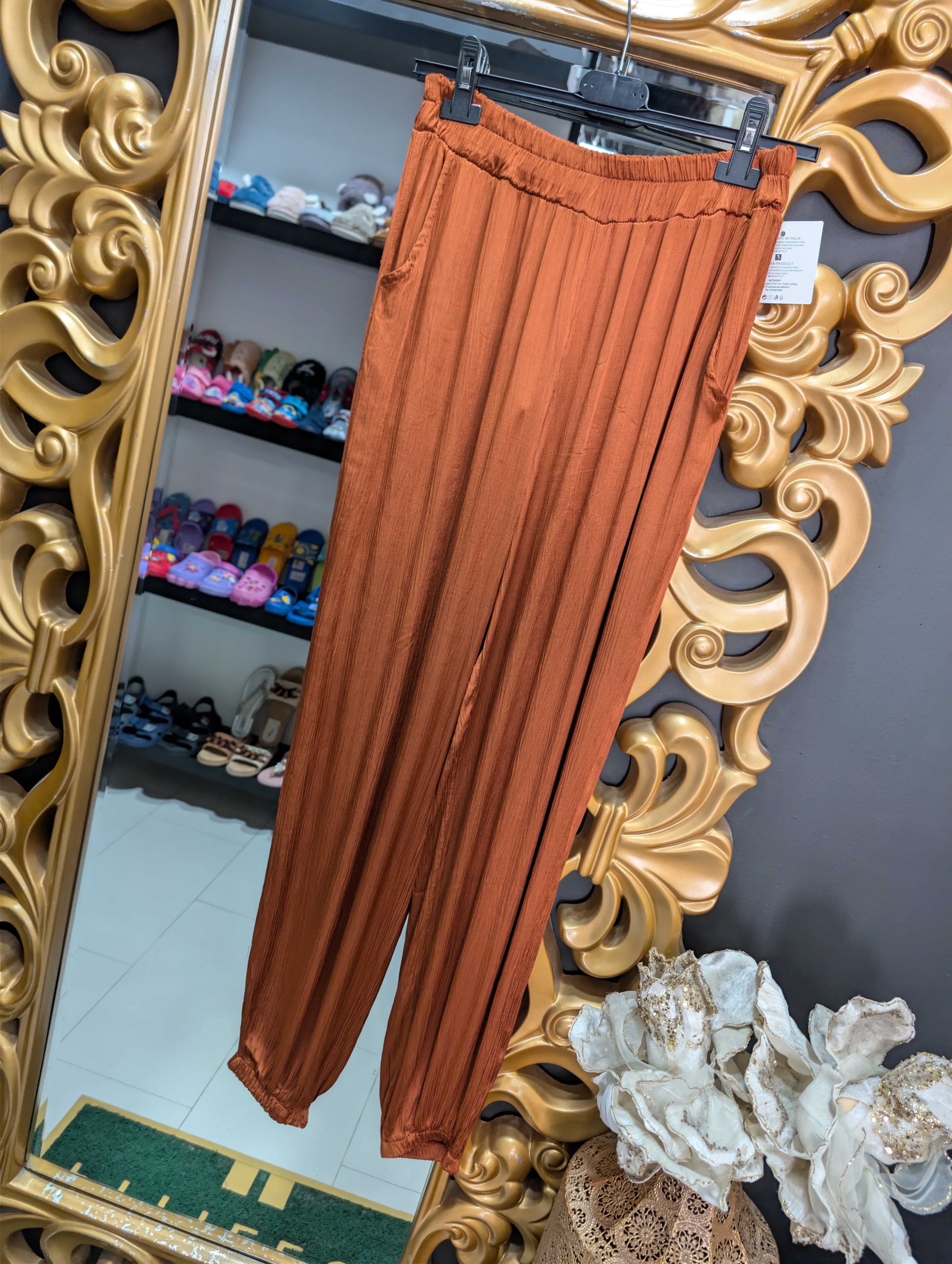PANTALÓN SATINADO CON TOBILLOS ELÁSTICOS Y BOLSILLOS EN COLOR CALDERA