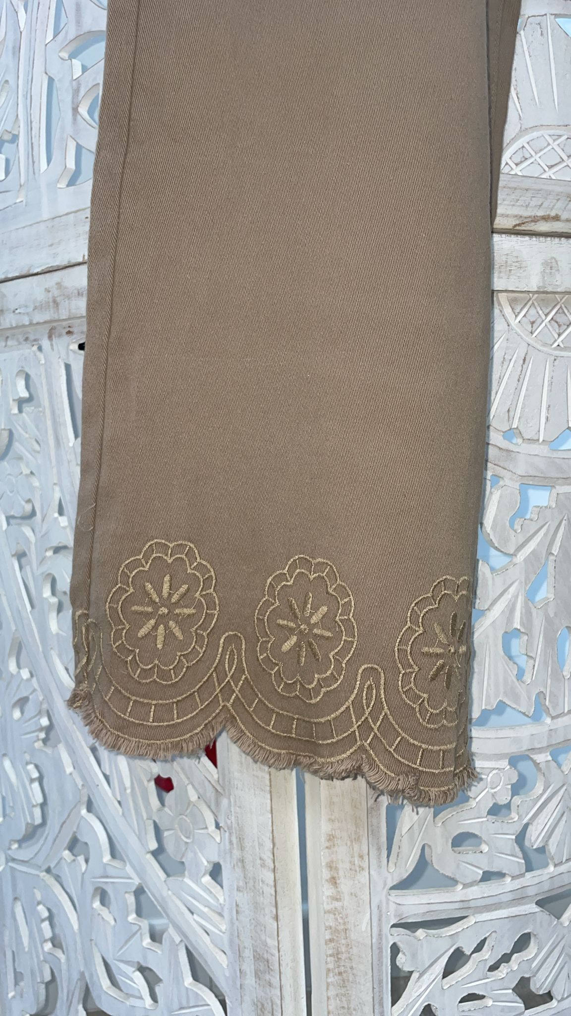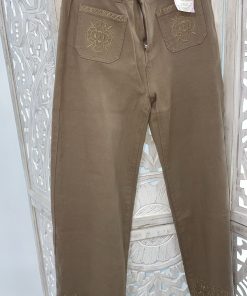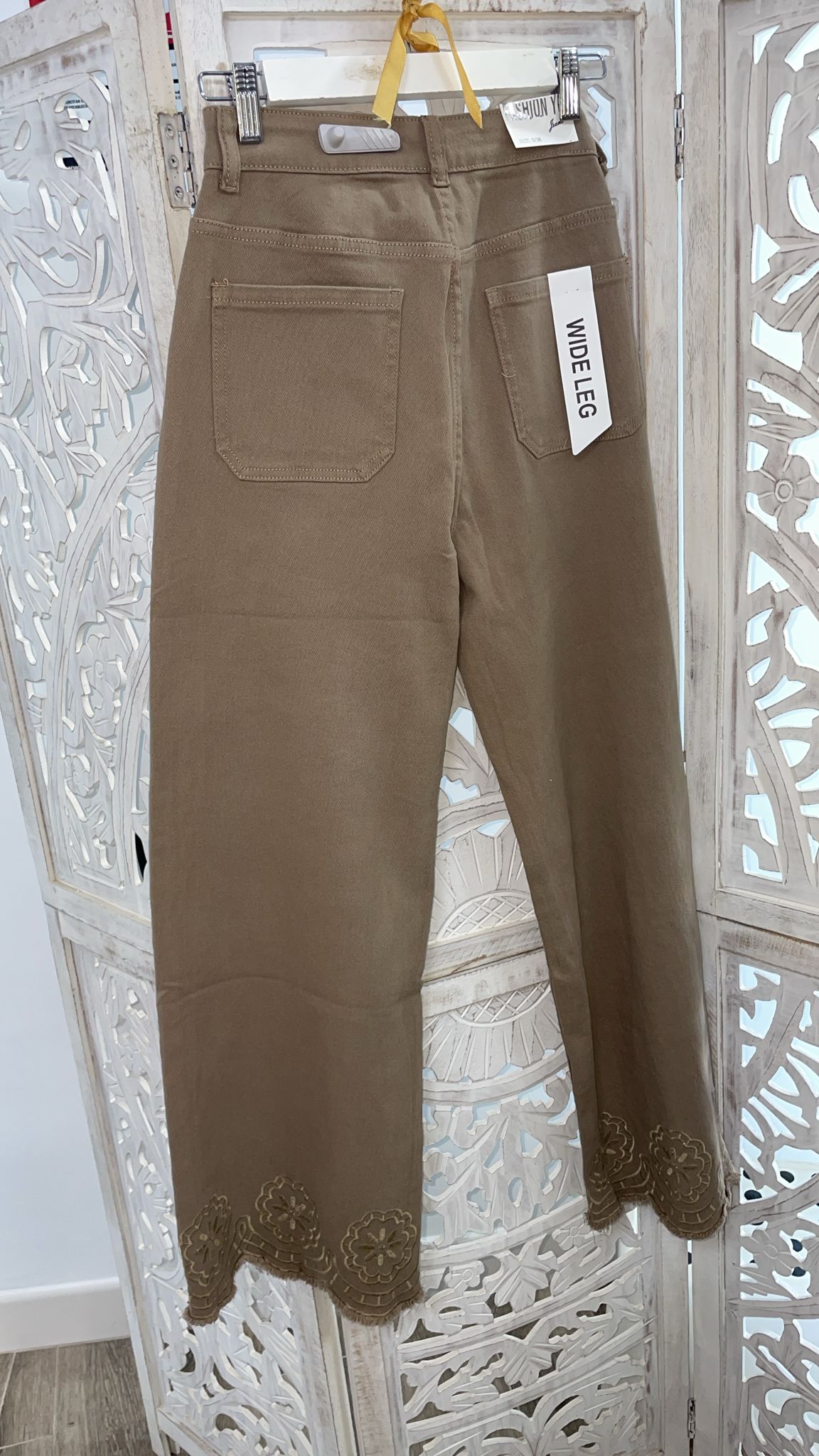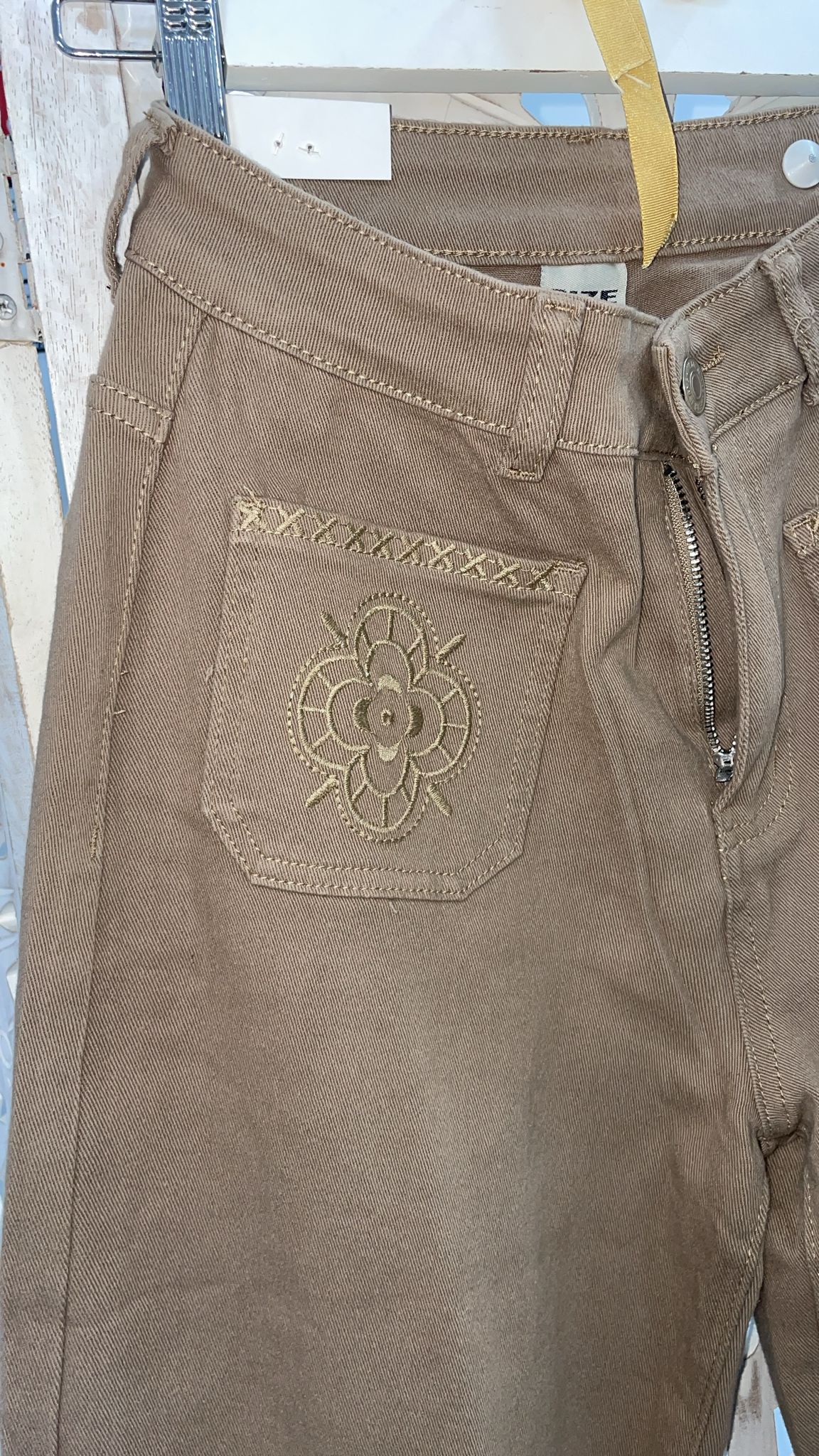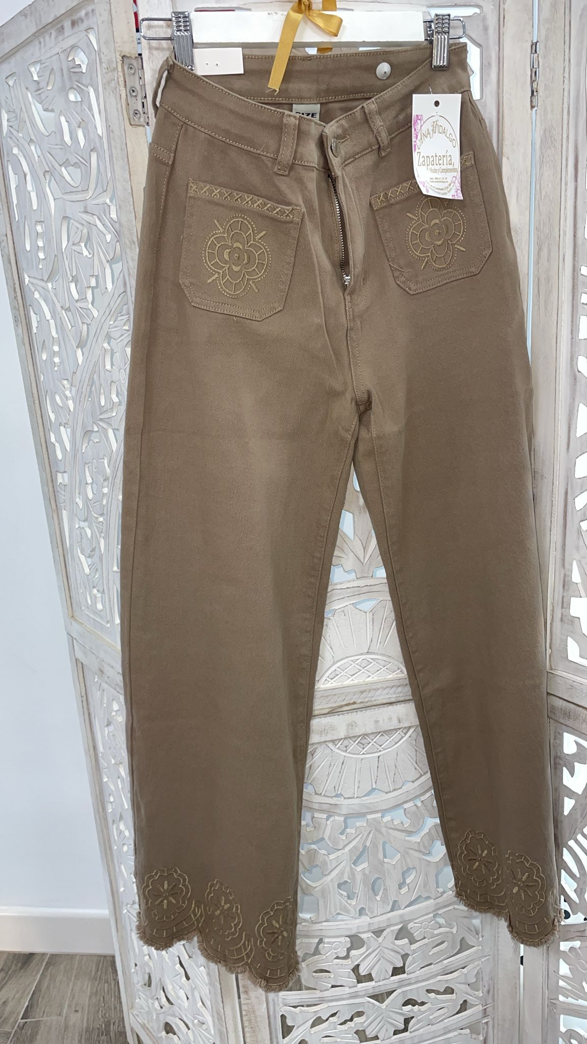 PANTALÓN VAQUERO DE PATA ANCHA EN COLOR CAMEL CON BORDADOS EN LOS BAJOS Y EN LOS BOLSILLOS DELANTEROS
