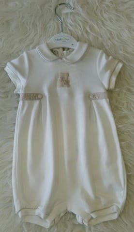 Modelo de pelele de niño para el verano, se distingue por un suave y bonito tejido en punto liso. La pieza principal es un bonito bordado en la parte de atrás alta coronando todo el conjunto.