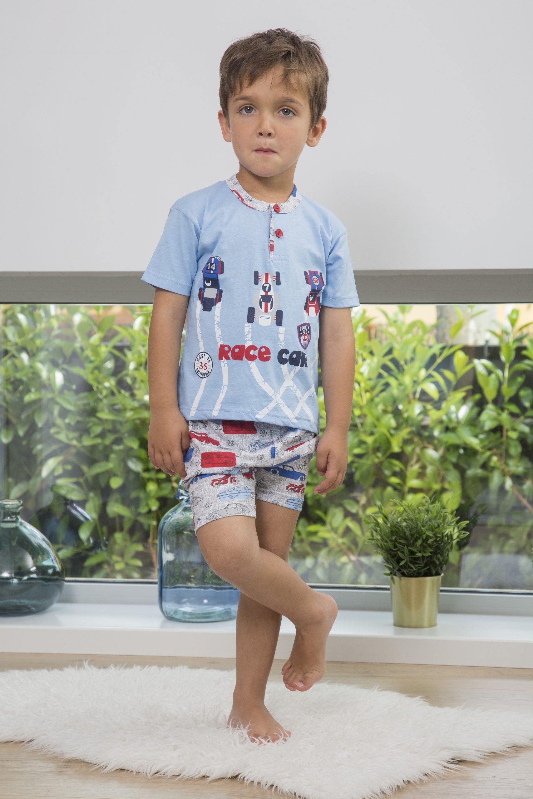 Precioso modelo formado por 2 piezas. Color celeste. Estampado de carreras de coche.
