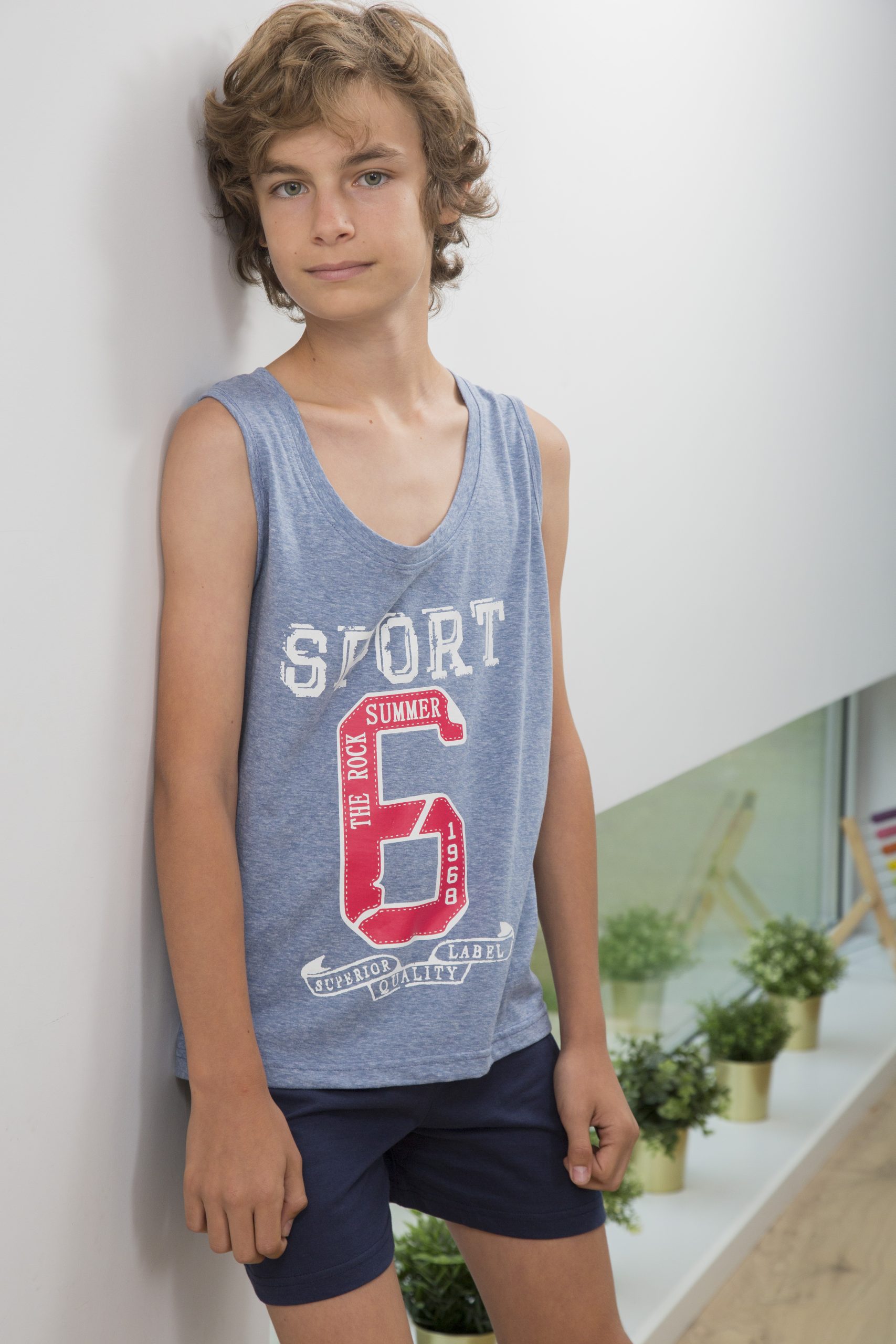 Precioso pijama formado por 2 piezas en tejido de algodón. Camiseta de tiranta con estampado «sport 6» a juego con pantalón corto en color marino liso.