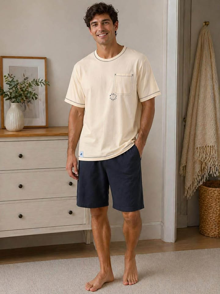 Precioso modelo de pijama de caballero de verano. Camiseta manga corta con bolsillo lateral y pantalón corto en color gris