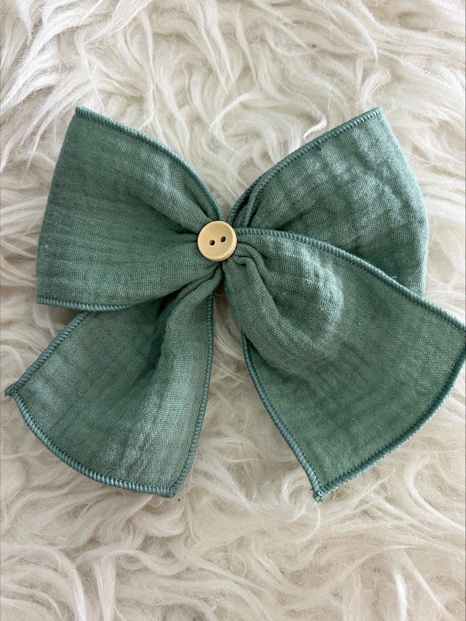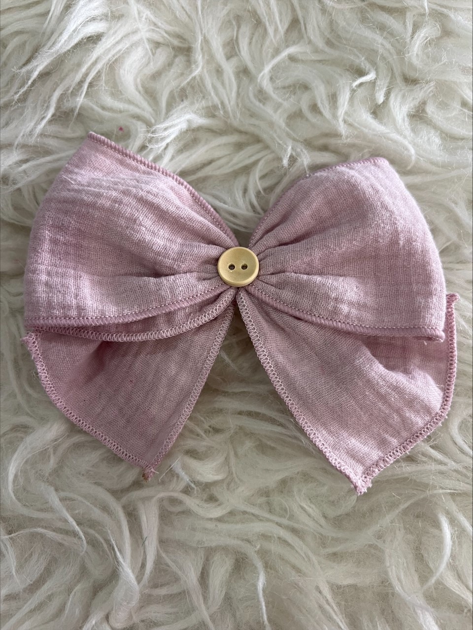 Precioso modelo de pinza con lazada en tejido de bambula con botón en color madera central.