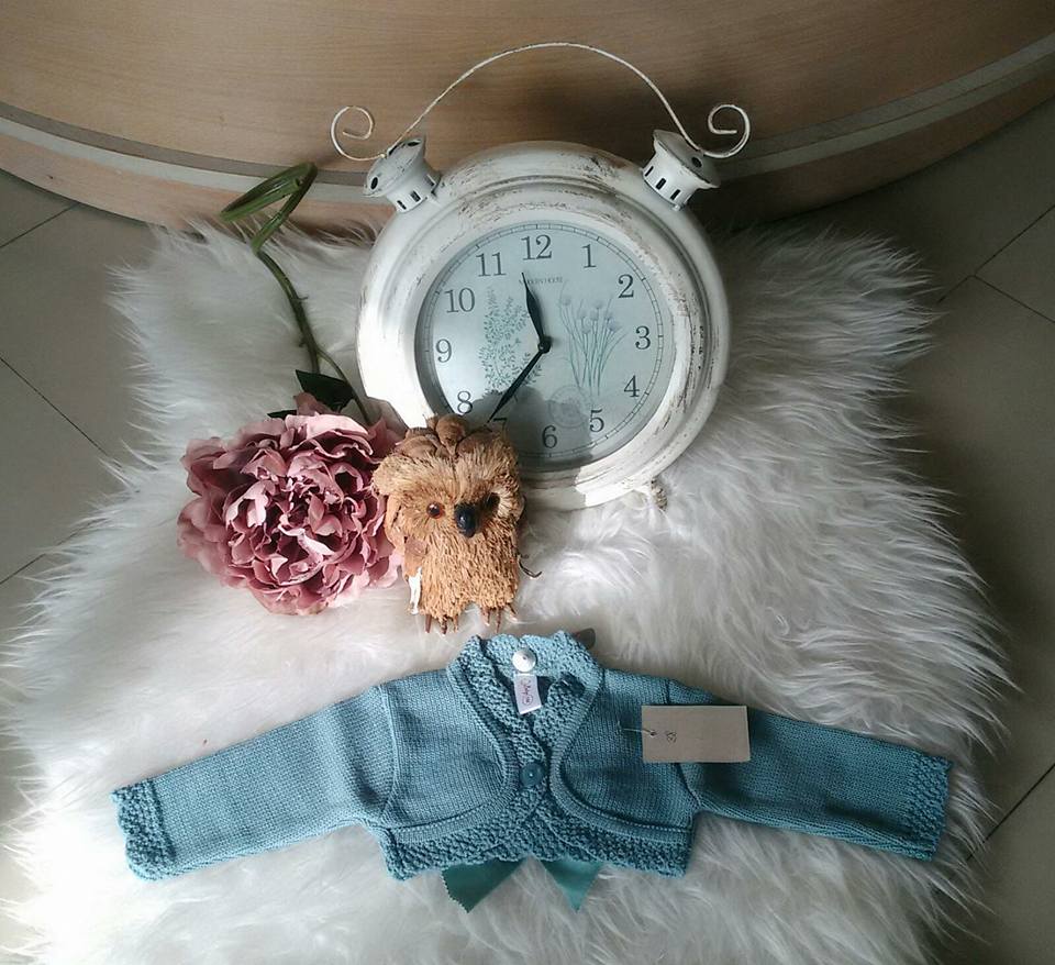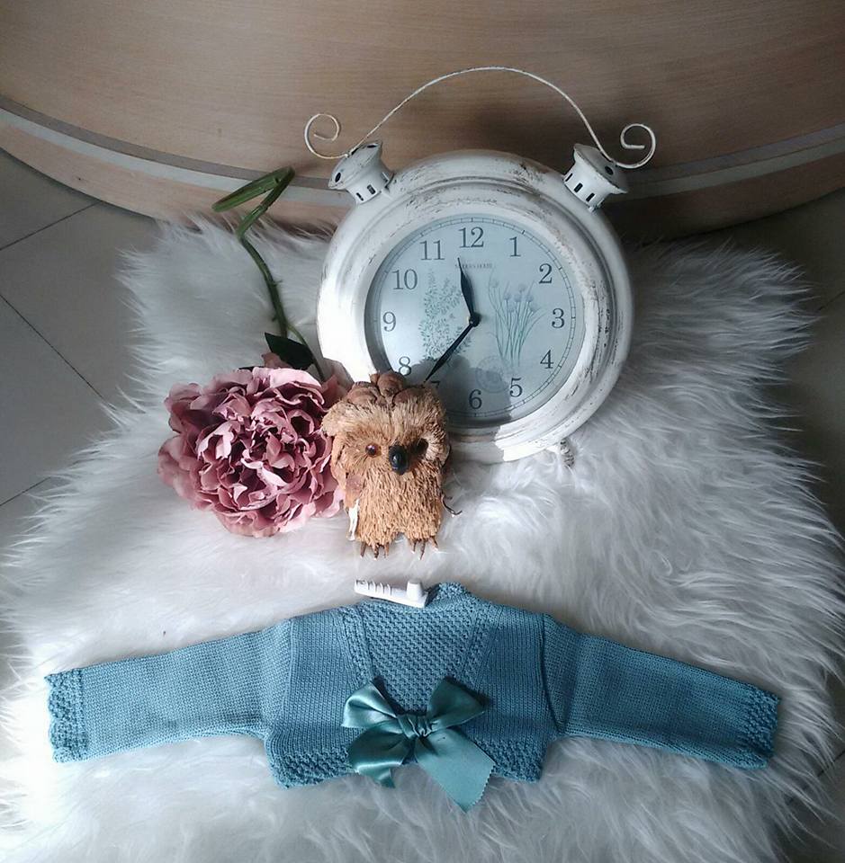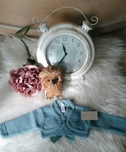 Preciosa rebeca cortita color verde, cerrada por la parte de delante con un botón y parte de atrás con un lazo del mismo tono. Nueva colección otoño-Invierno.