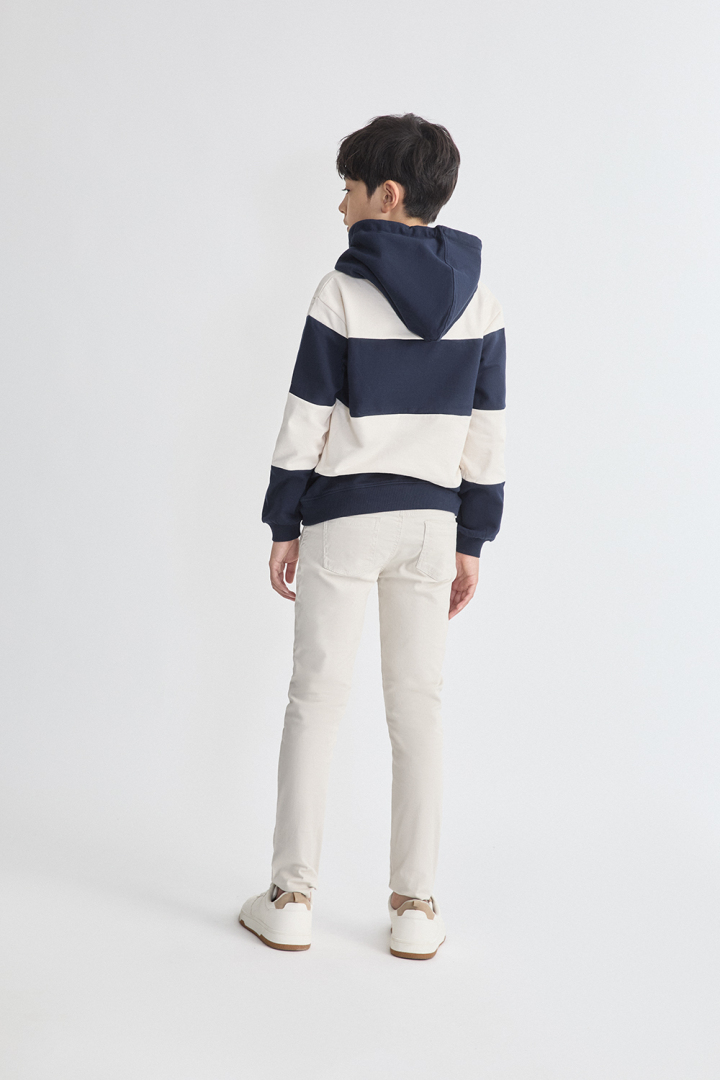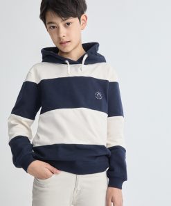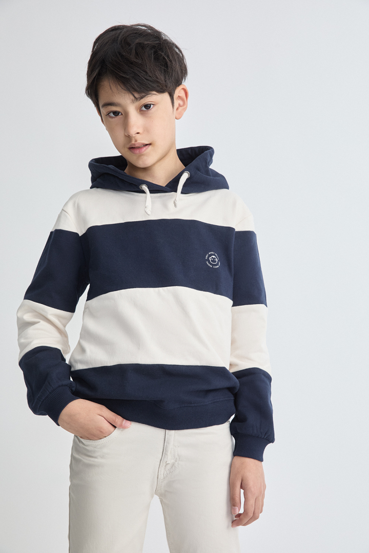 Sudadera de felpa perchada con diseño a rayas anchas en dos tonos, capucha con cordón y puños y bajo de canalé elástico. Incluye un pequeño estampado con texto y carita sonriente en el pecho que le da un toque desenfadado. Una prenda cálida y moderna, perfecta para sus planes de invierno más urbanos.