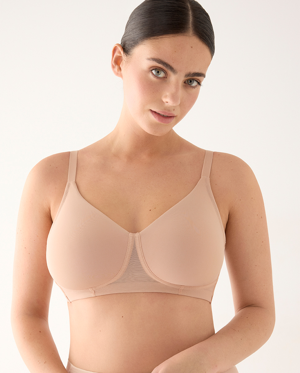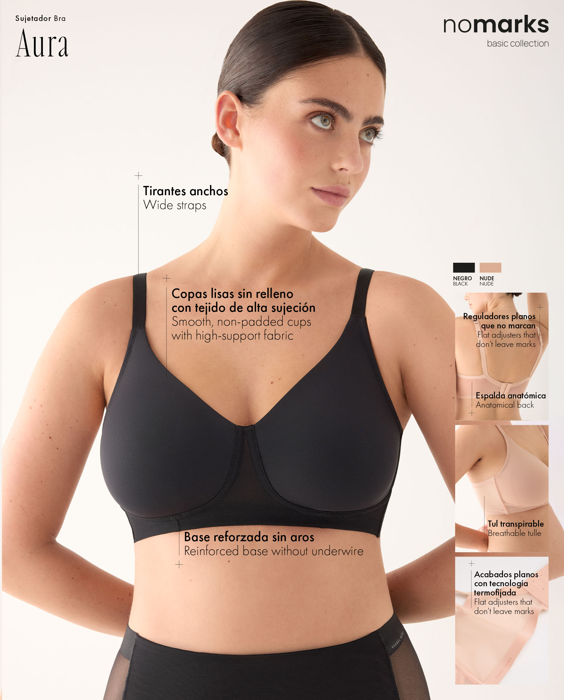 Inspirado en la sencillez estética de nomarks, el modelo Aura busca favorecer el bienestar diario y la libertad de movimiento. Es un sujetador reductor sin aros que abraza y recoge el busto suavemente.Base reforzada: Ofrece una estructura cómoda sin necesidad de aros.Máxima discreción: Acabados planos con tecnología termofijada y espalda anatómica.Confort térmico: Alas anchas de tul transpirable y tirantes anchos para mejorar la sujeción.