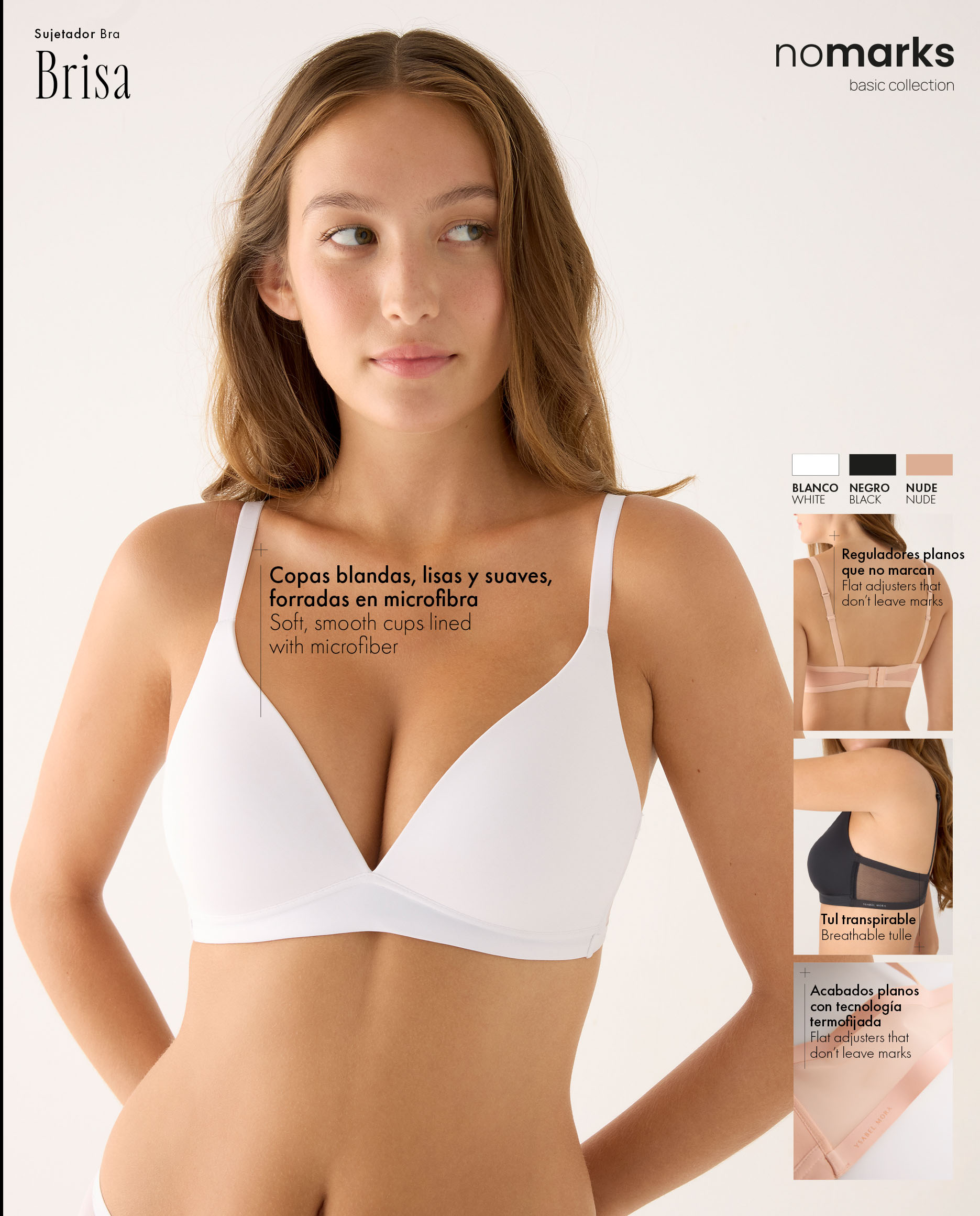 Dentro de la línea nomarks, el modelo Brisa representa una vida sin presiones y un diálogo de bienestar con tu cuerpo. Es un sujetador sin aros que maximiza la comodidad sin perder la forma.Confort extremo: Copas blandas y lisas forradas en suave microfibra.Ajustadores planos: Diseñados específicamente para evitar molestias y marcas en la piel.Acabado invisible: Tecnología de termofijado para una adaptación perfecta a la silueta.