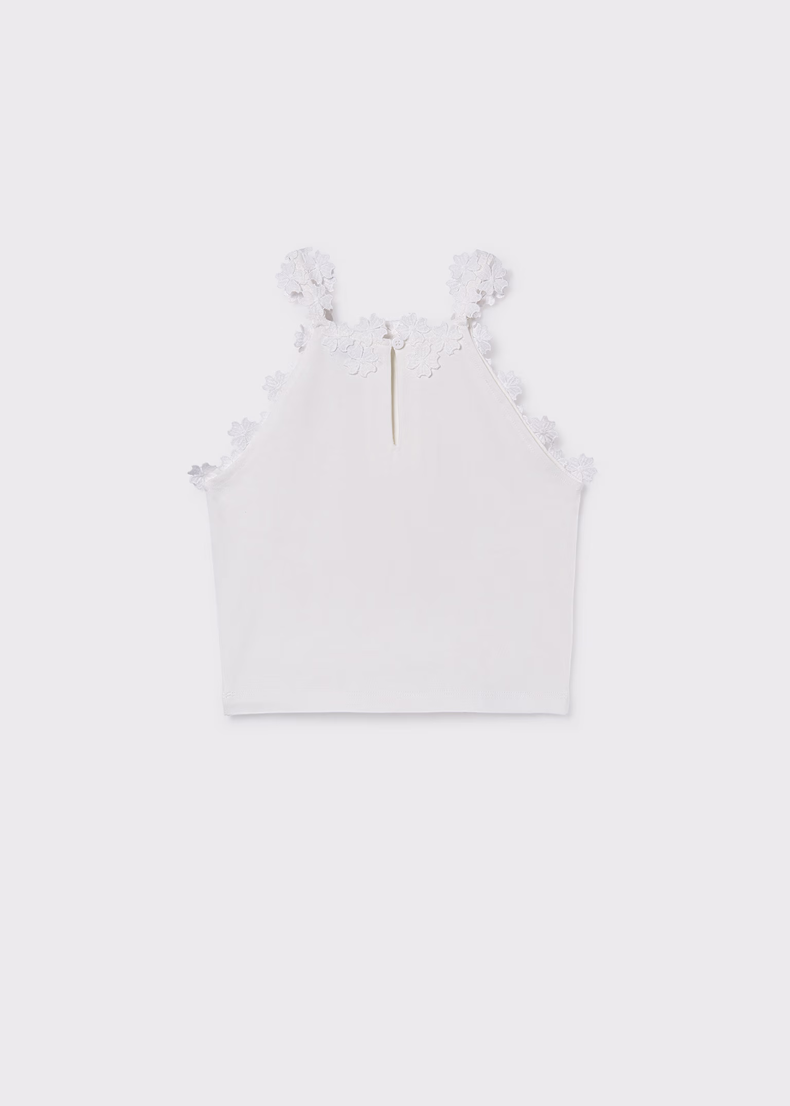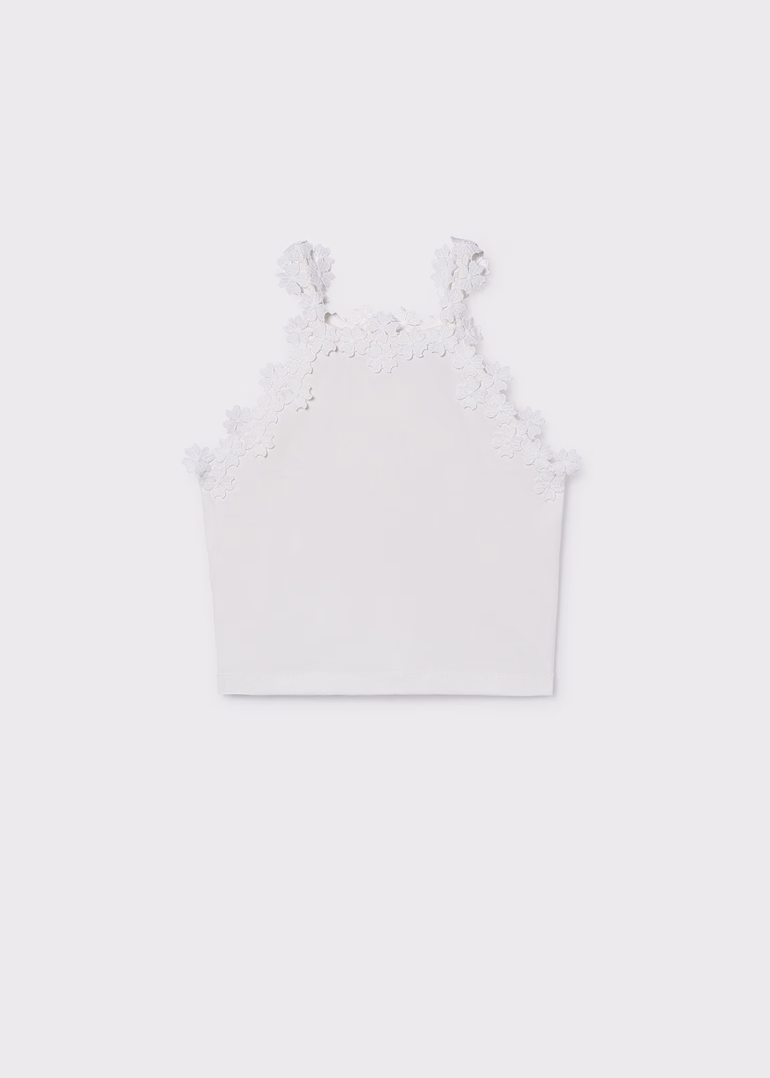 Camiseta sin mangas para niña con cuello halter. Incorpora aplicaciones florales decorativas y abertura trasera. Disponible en la talla desde los 8 a los 16 años.