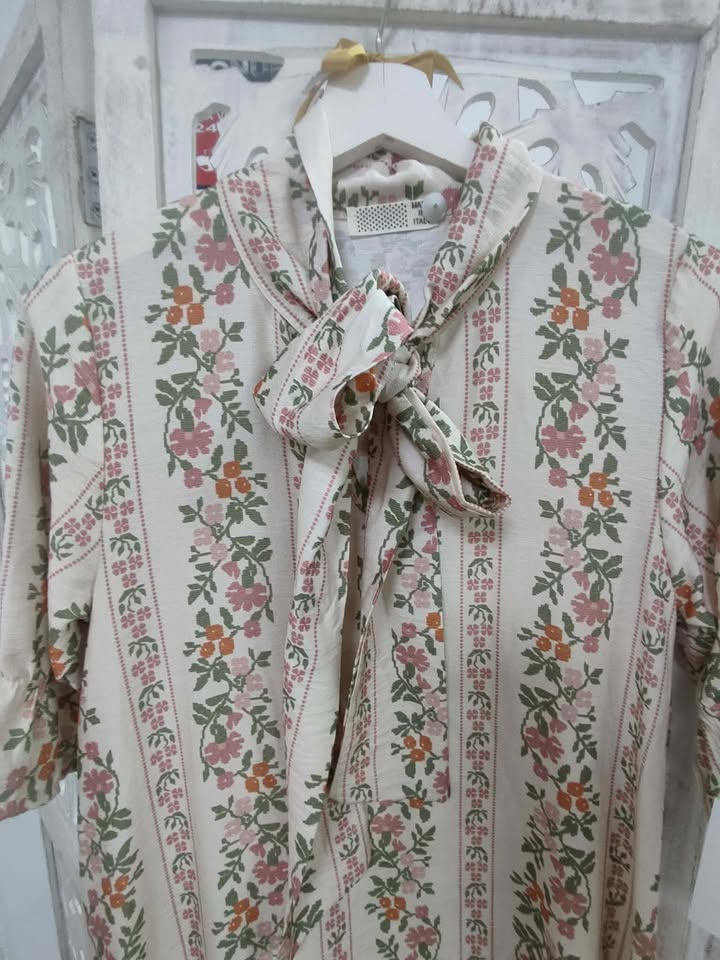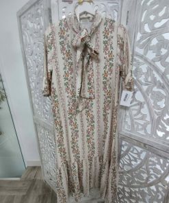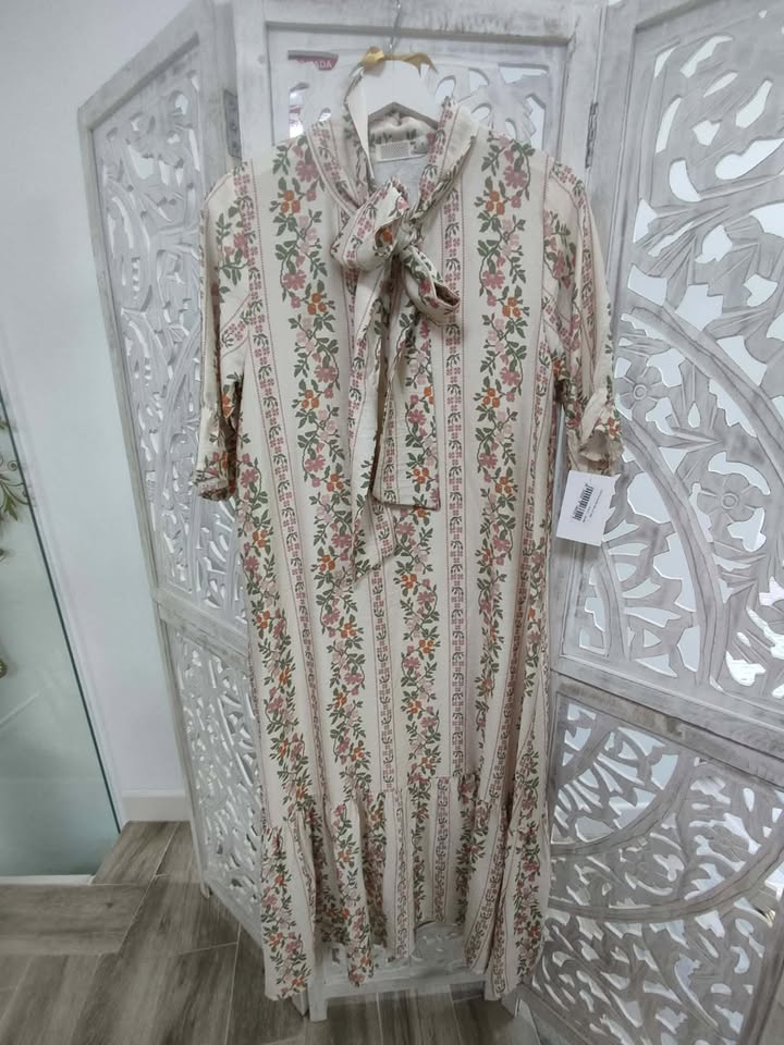VESTIDO DE ESTAMPADO FLORAL EN TONALIDADES BEIGE, VERDE, TEJA Y ROSA.