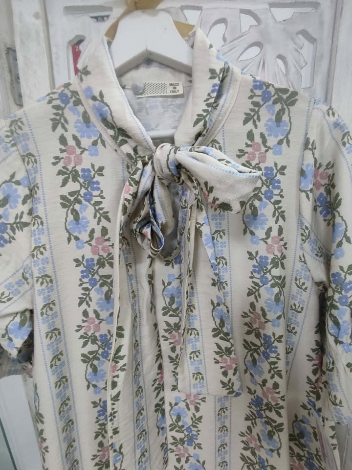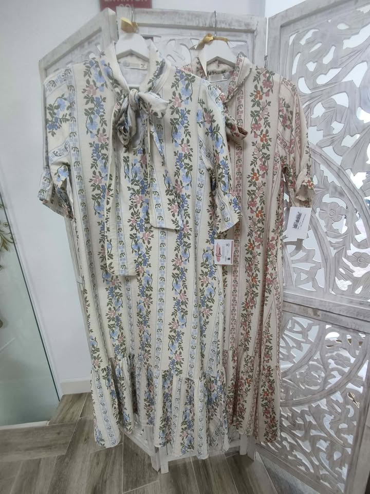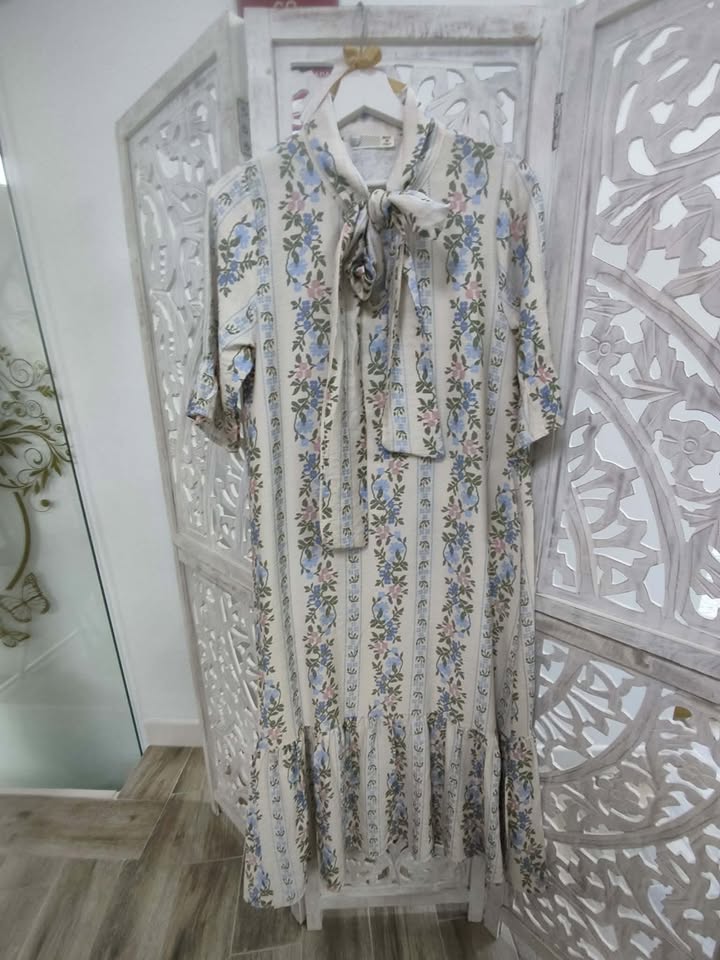 VESTIDO DE ESTAMPADO FLORAL EN TONALIDADES BEIGE, CELESTE, VERDE Y ROSA.